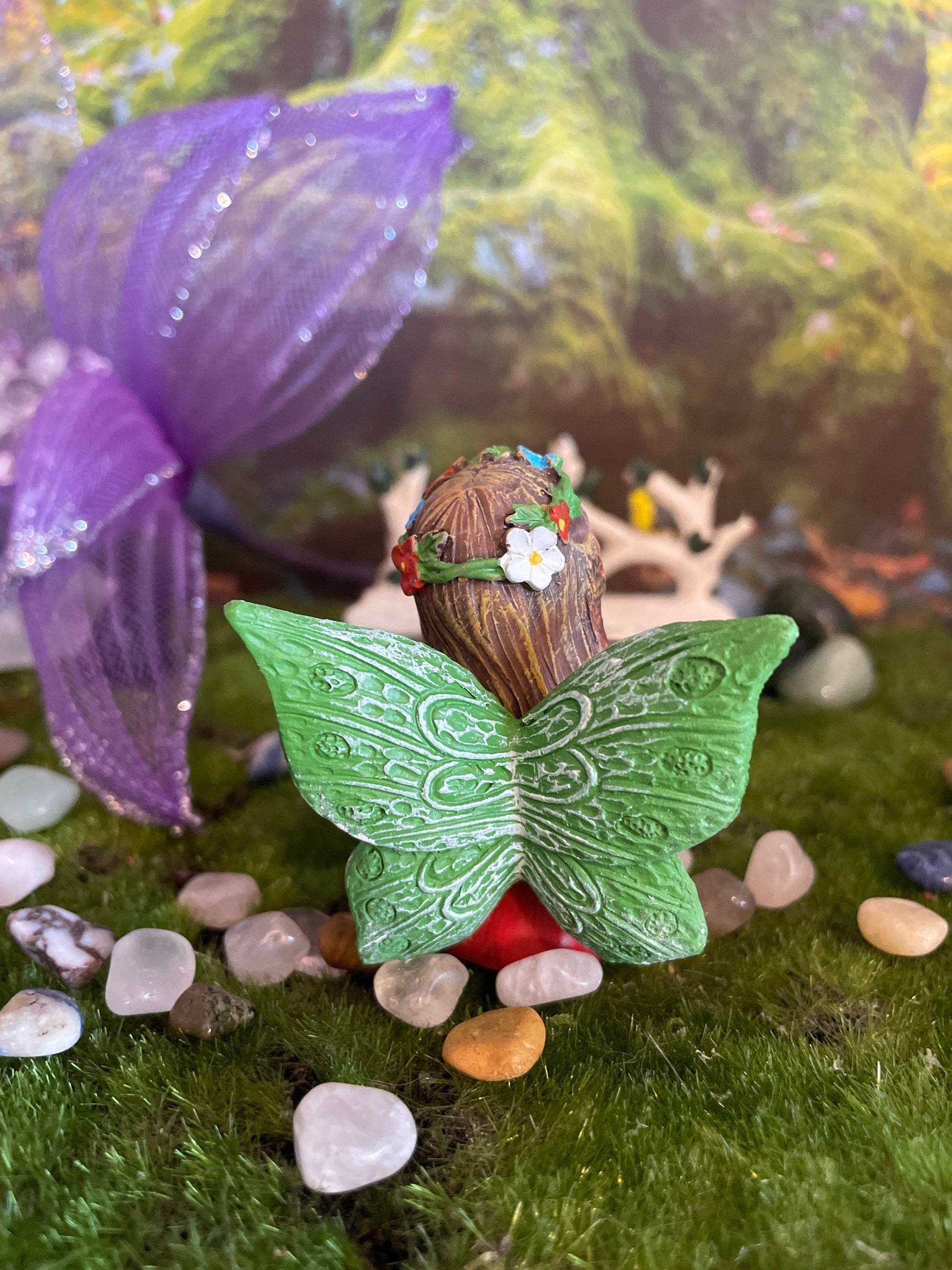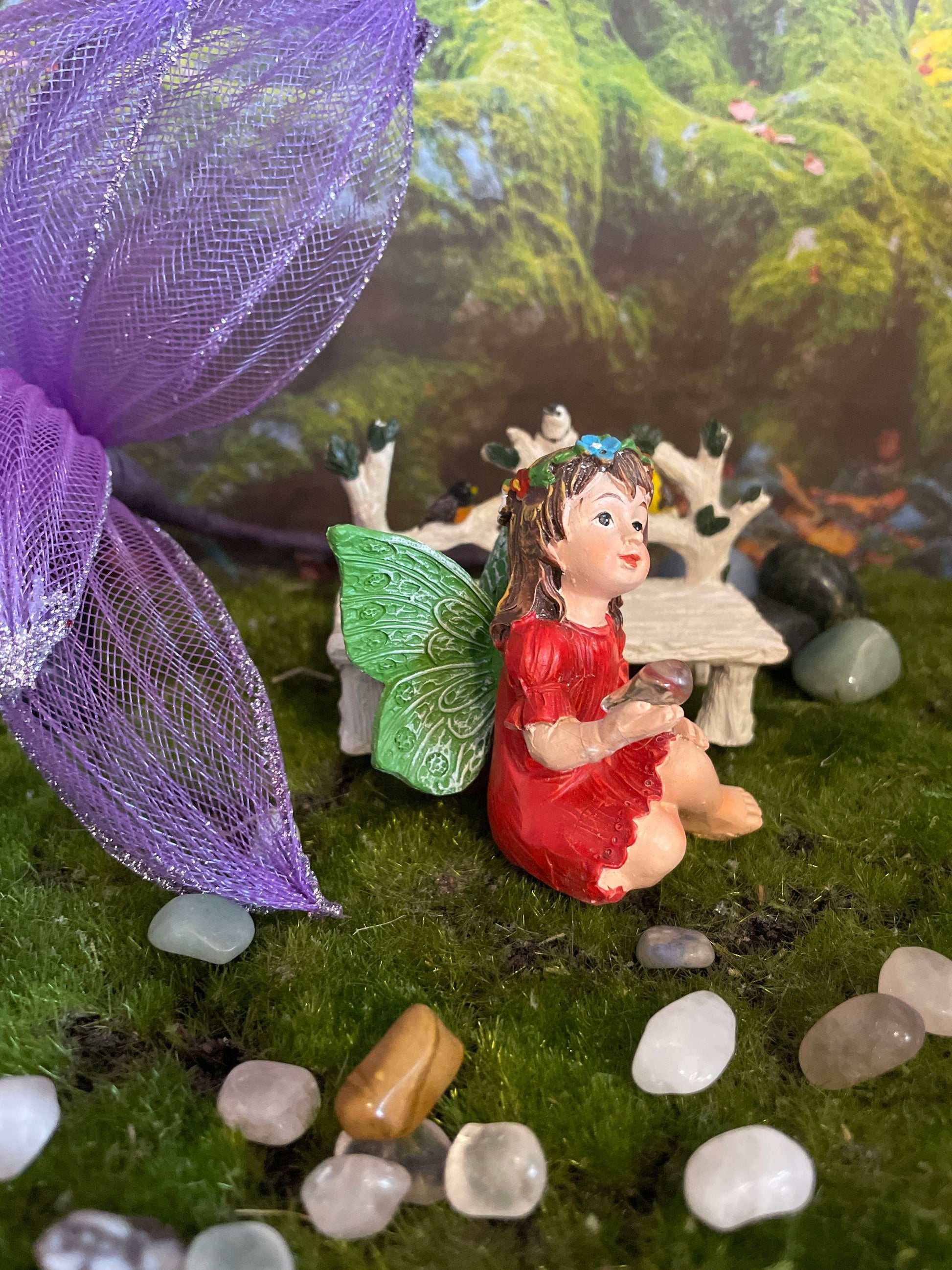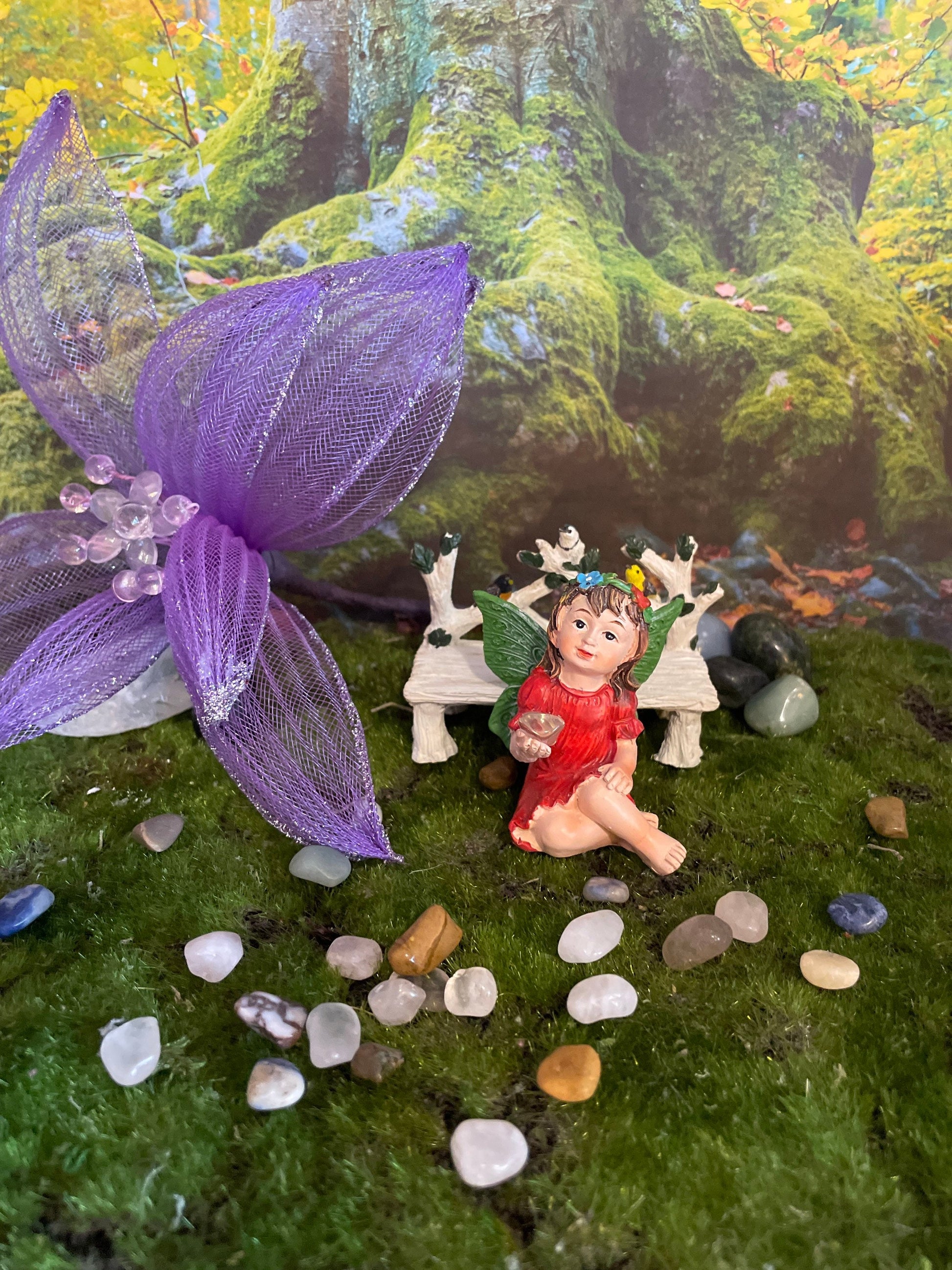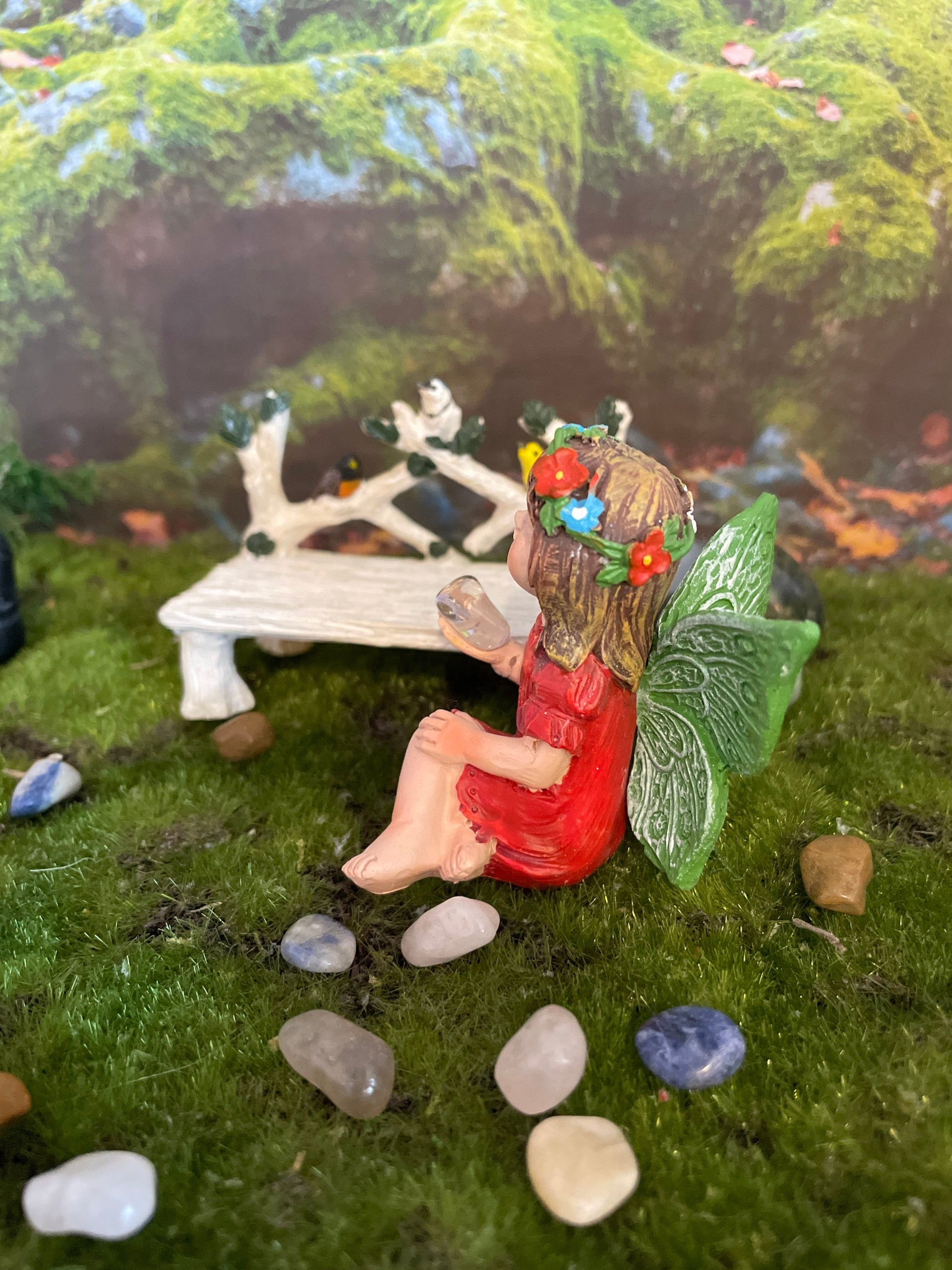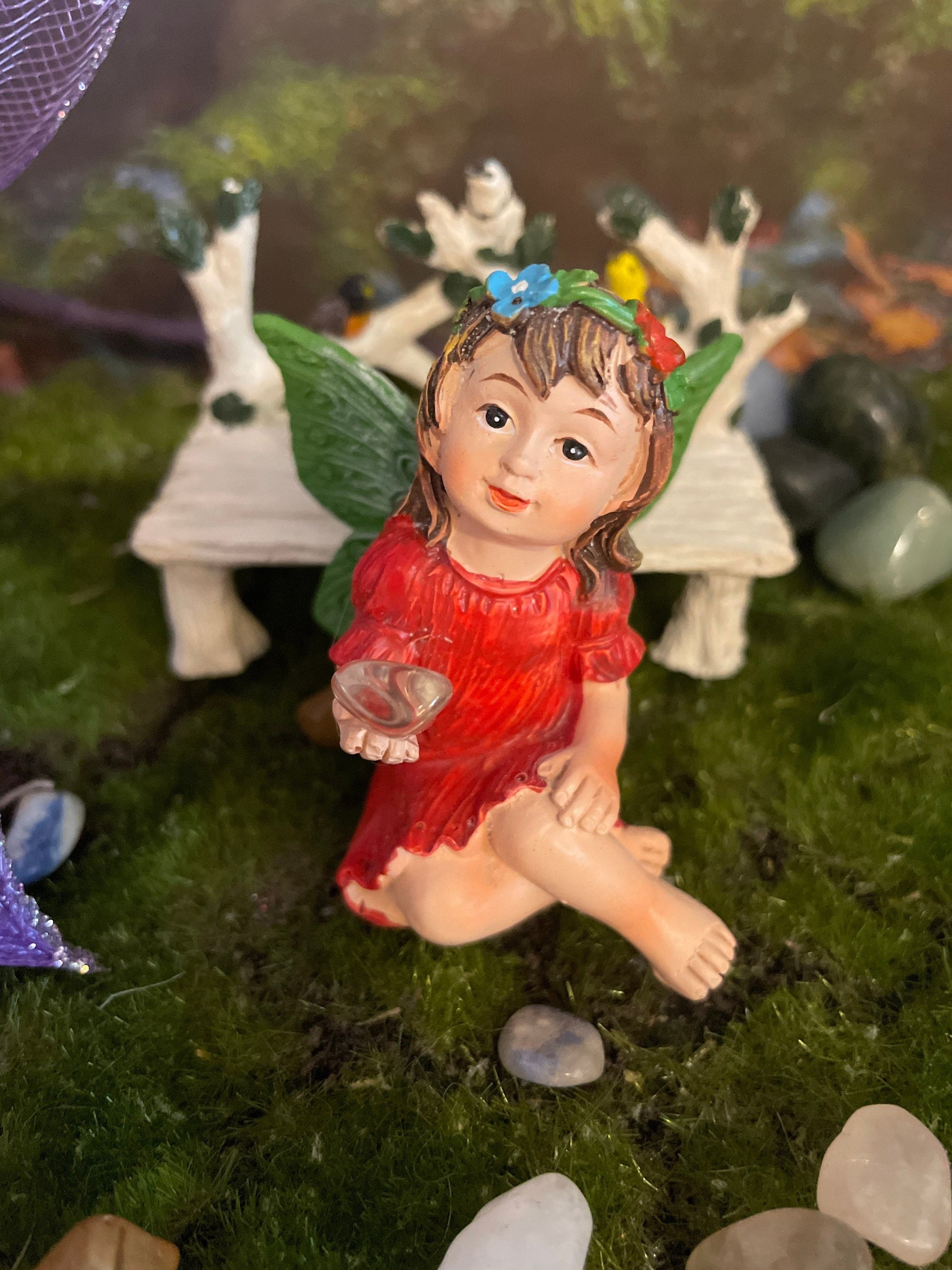 This sweet, magical fairy is wearing a crown of flowers that match her red/orange dress. In her hand lays a clear quartz crystal that she found while crystal hunting with her friends. Fairies are naturally drawn to crystals because of their sparkle, so a small bag with crystals is included with her! Scatter them around our fairy garden!