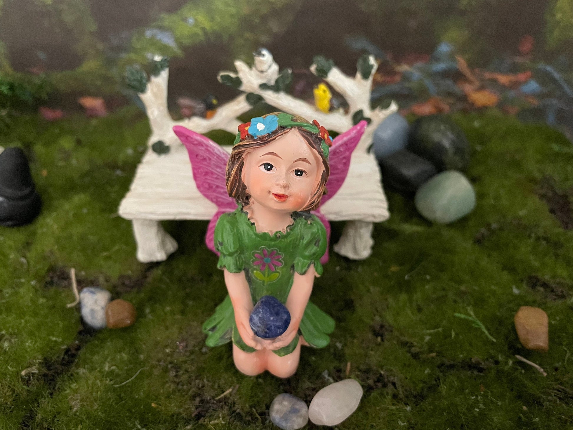 This sweet, magical fairy is wearing a crown of flowers that match her green dress. On her dress, is a sweet pink flower that matches her wings! In her hand, she is holding an Aventurine crystal that she found while crystal hunting with her friends. Fairies are naturally drawn to crystals because of their sparkle, so a small bag with crystals is included with her! Scatter them around our fairy garden!