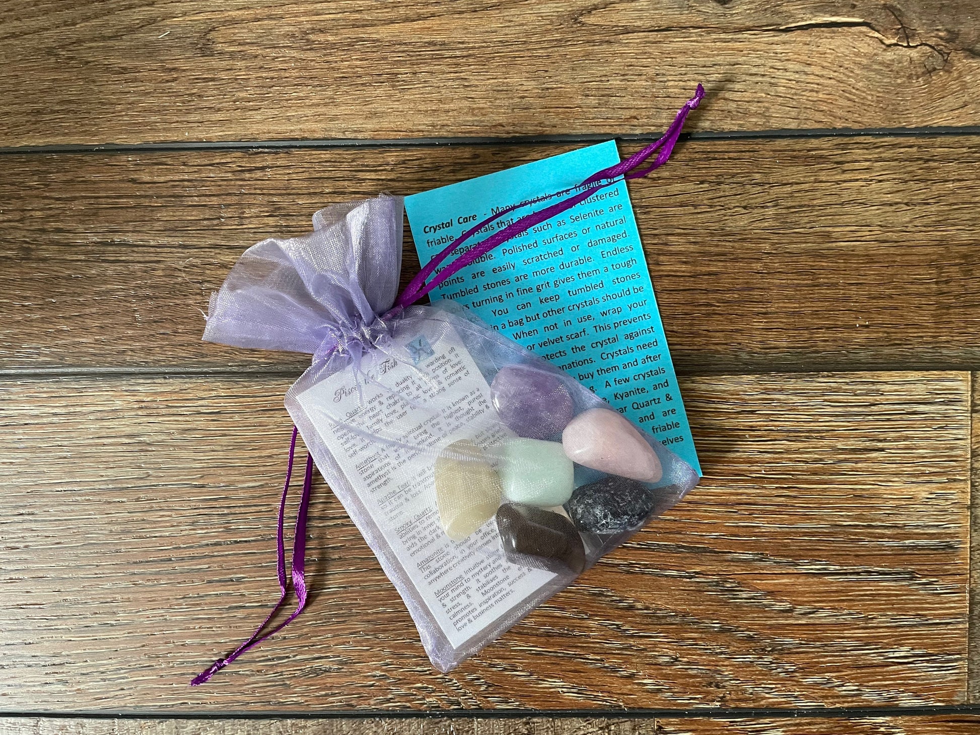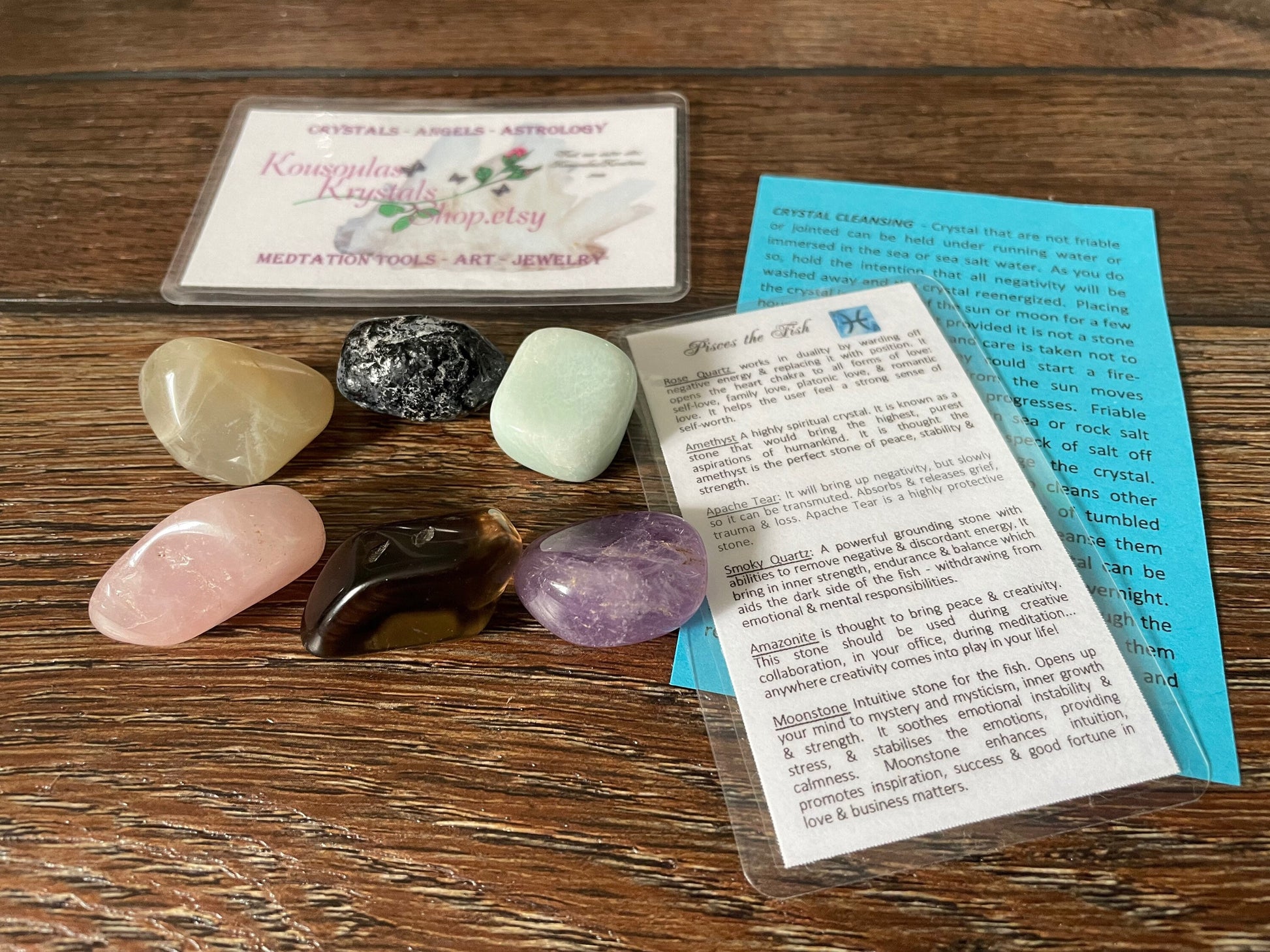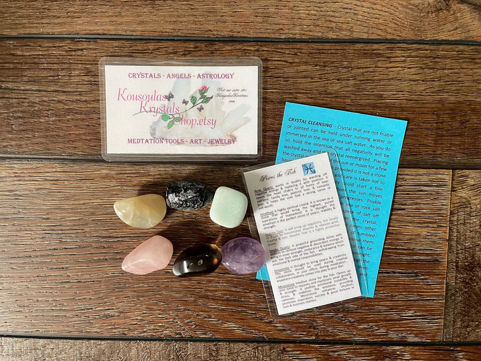 Pisces Stones Set includes: Rose Quartz Amethyst Apache Tear Smoky Quartz Amazonite Moonstone Your tumble-polished and/or raw stones and crystals are chosen based on their energetic properties and are intended to complement the fish's positive traits, supplement imbalances, and protect against downfalls. Stones crystal properties, crystal care and cleaning for Pisces are included. The stones/crystals will arrived sealed in a beautiful 4" x 6" nylon pouch. Hold them, meditate with them, carry them in your pocket, purse or car, place them on your desk at work, or under your pillow at night. I can’t think of a more personal GIFT for Pisces in your life – children and adults alike! 😊. Stones may be raw or tumbled. Because these are natural products, no stone will be alike.