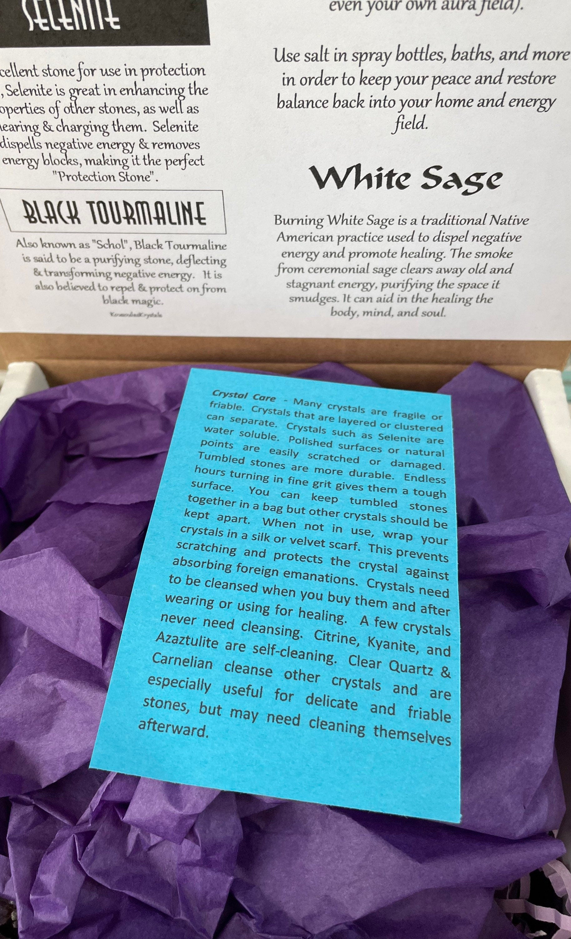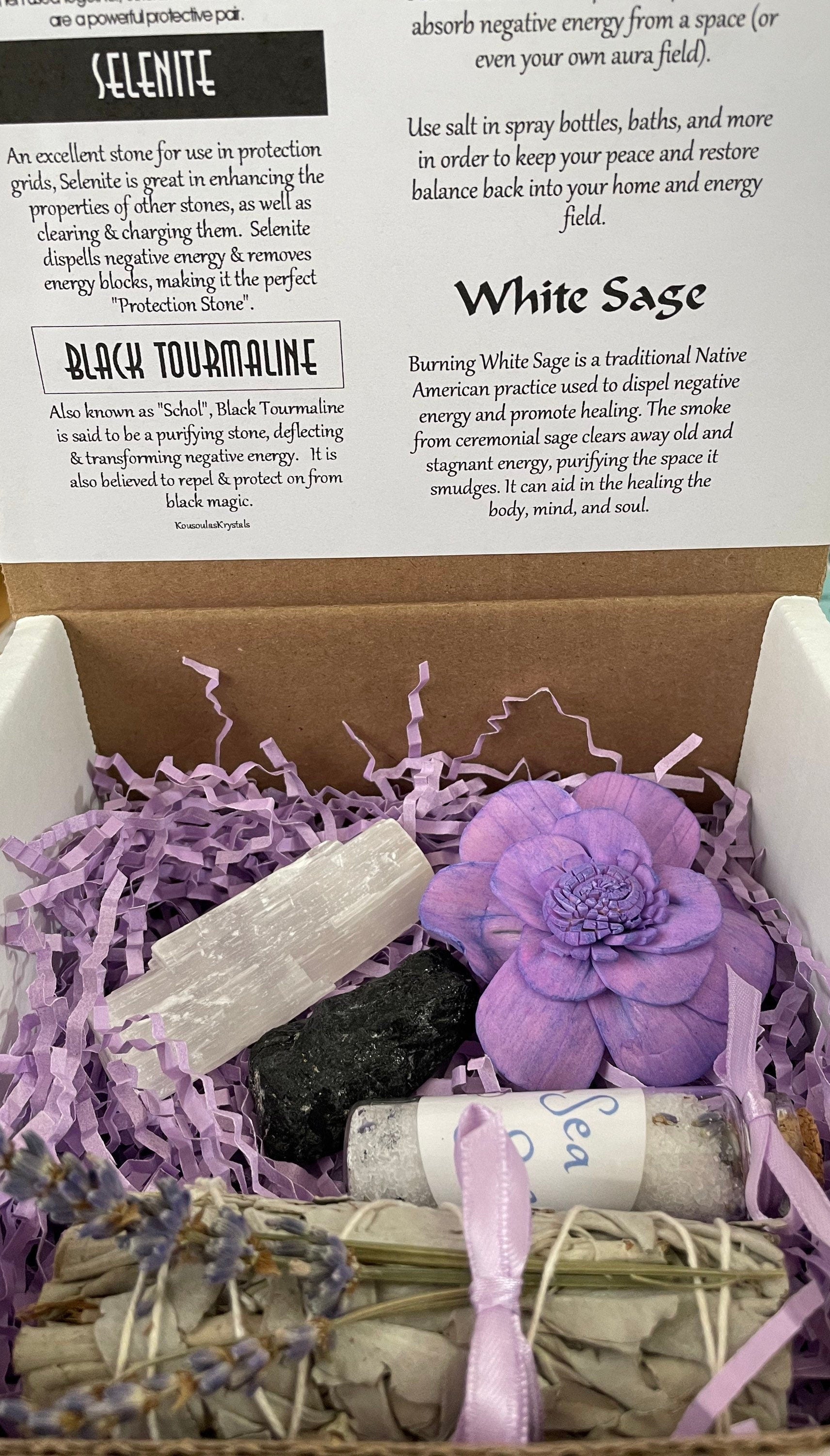 Gift or keep this powerful 4 piece protecting and cleansing crystal set. Included in this set is: 1 raw Black Tourmaline 1 3” Selenite wand 1 oz Sea Salt Lavender mix 1 White Sage Smudging Stick Also included is product information and usage card, dried flowers and packing materials.
