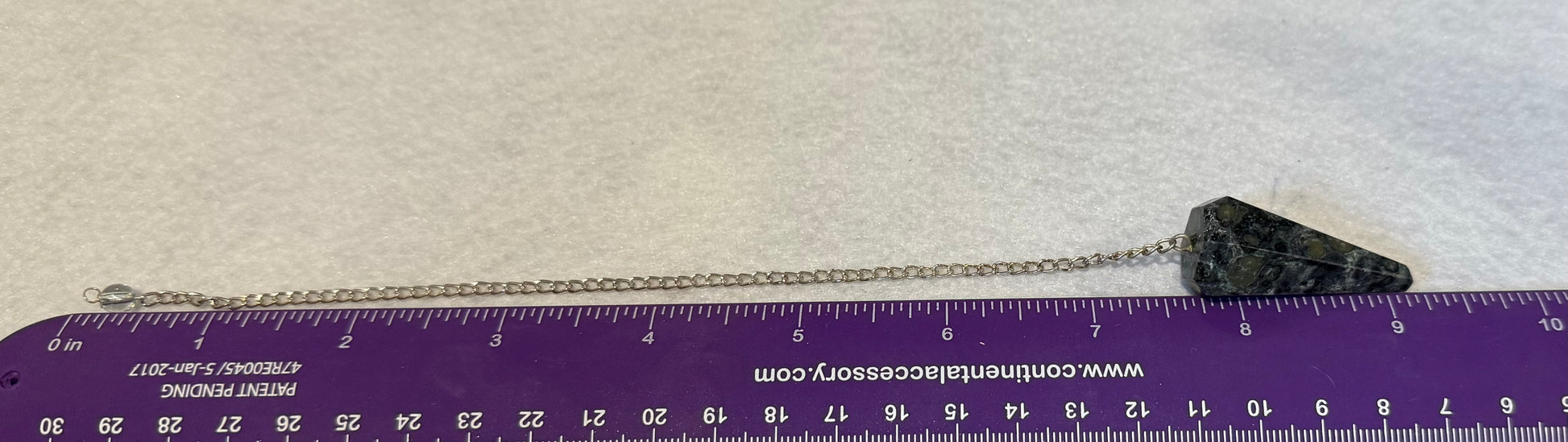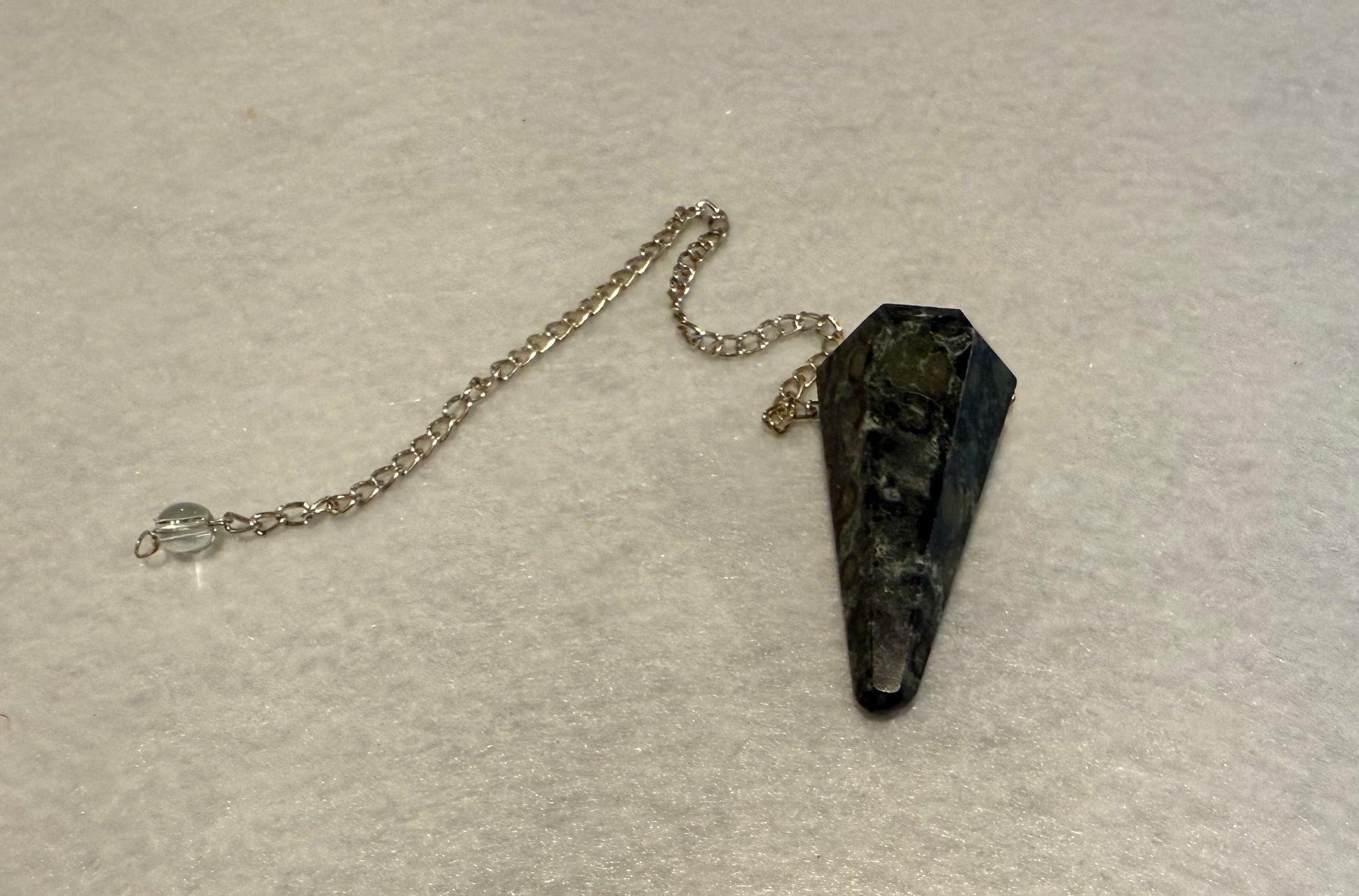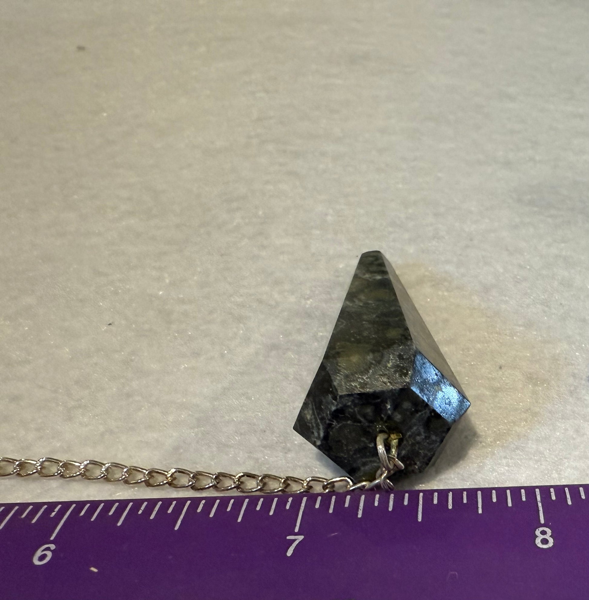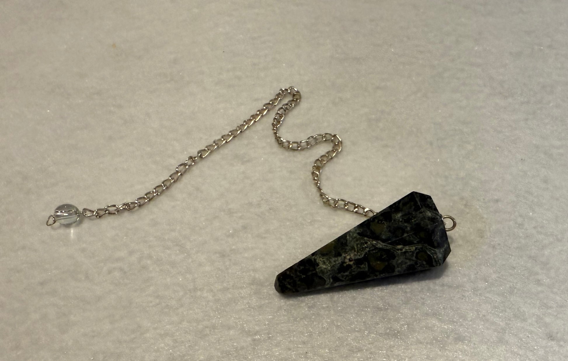 This beautiful Kambaba Jasper Pendulum is 1.5” and with chain is 9.25”. Please look at all pictures to see all sides of this pendulum.
