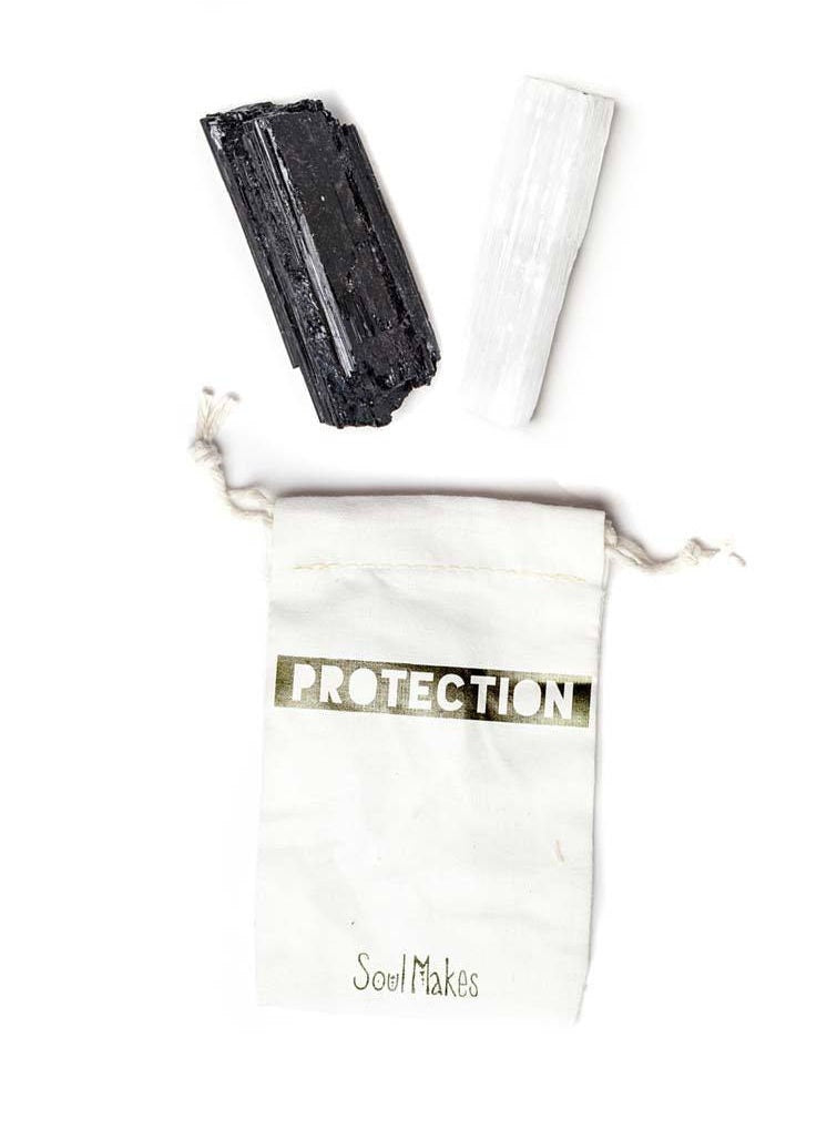 When used together, Selenite and Black Tourmaline are a powerful protective pair for your home. Includes: 1- Selenite, 1- Black Tourmaline, 1- Stamped canvas pouch, 1- Stone Meanings Card Approx. length of each stone - 2" to 3" Each stone is unique. Size and color will vary.