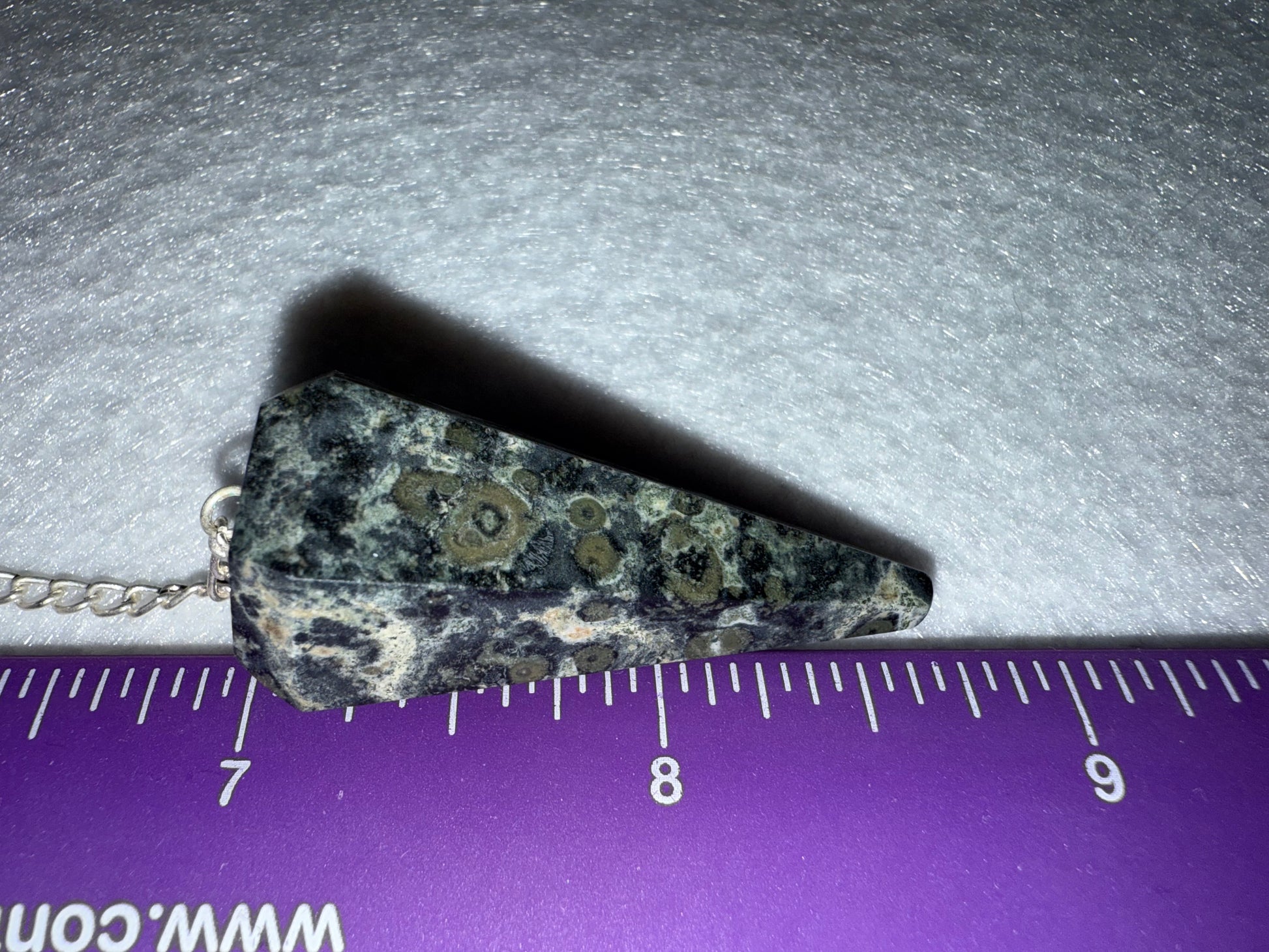 This beautiful Serpentine Pendulum is 1.75” and with chain is 9.25”. Please look at all pictures to see all sides of this pendulum.