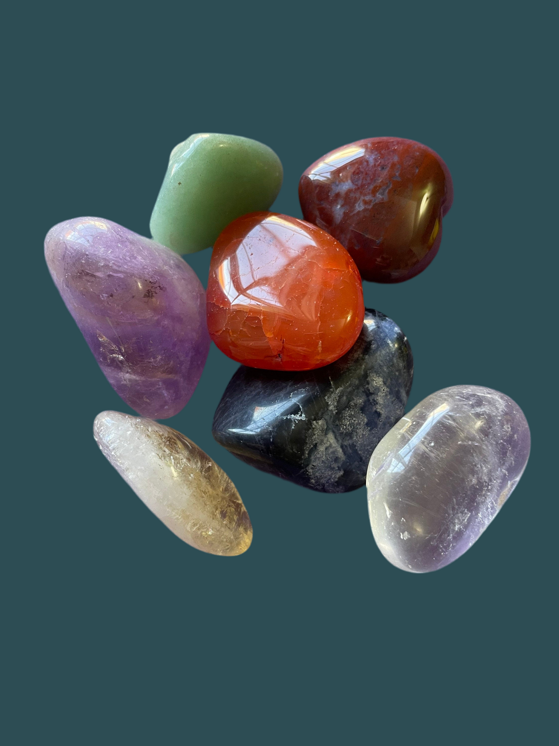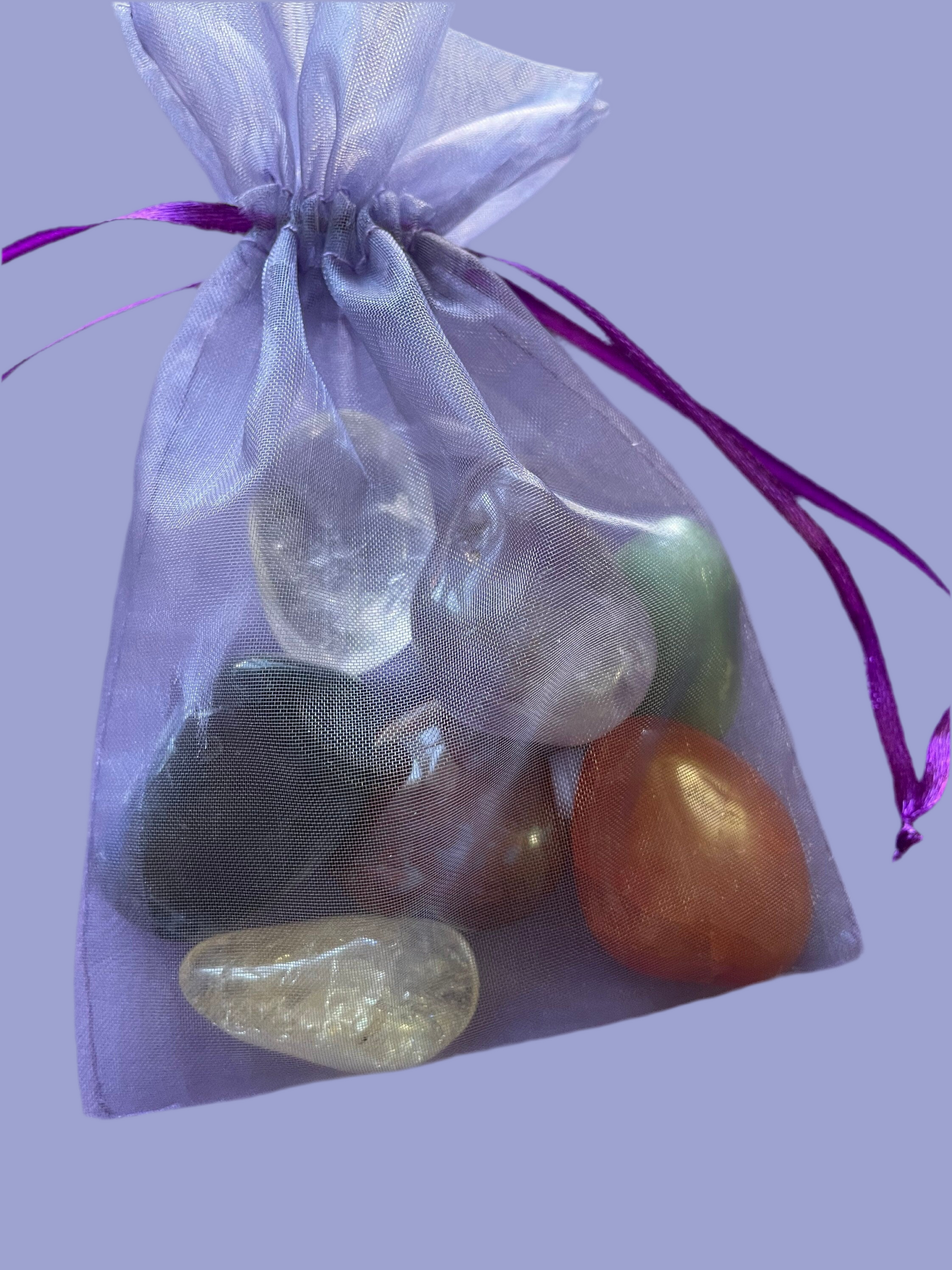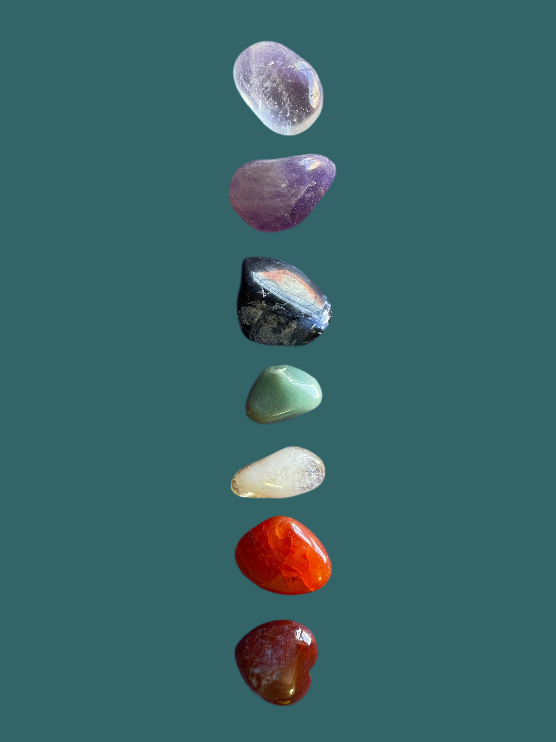 Chakra stones are used for both healing & energizing the entire body or certain areas that need help. This practice can be done with mediation to include healing of the mind as well. Also, energizing & strengthening the body at the same time as the mind can assist both in maximizing their healing on a day to day basis & give them the ability to maintain it. Place each stone on the corresponding body area during meditation. To cleanse the stones, place in the light of the FULL moon or in sea salt. Also, placing stones with clear quartz crystal will work. This 7-piece gemstone CHAKRA set include: