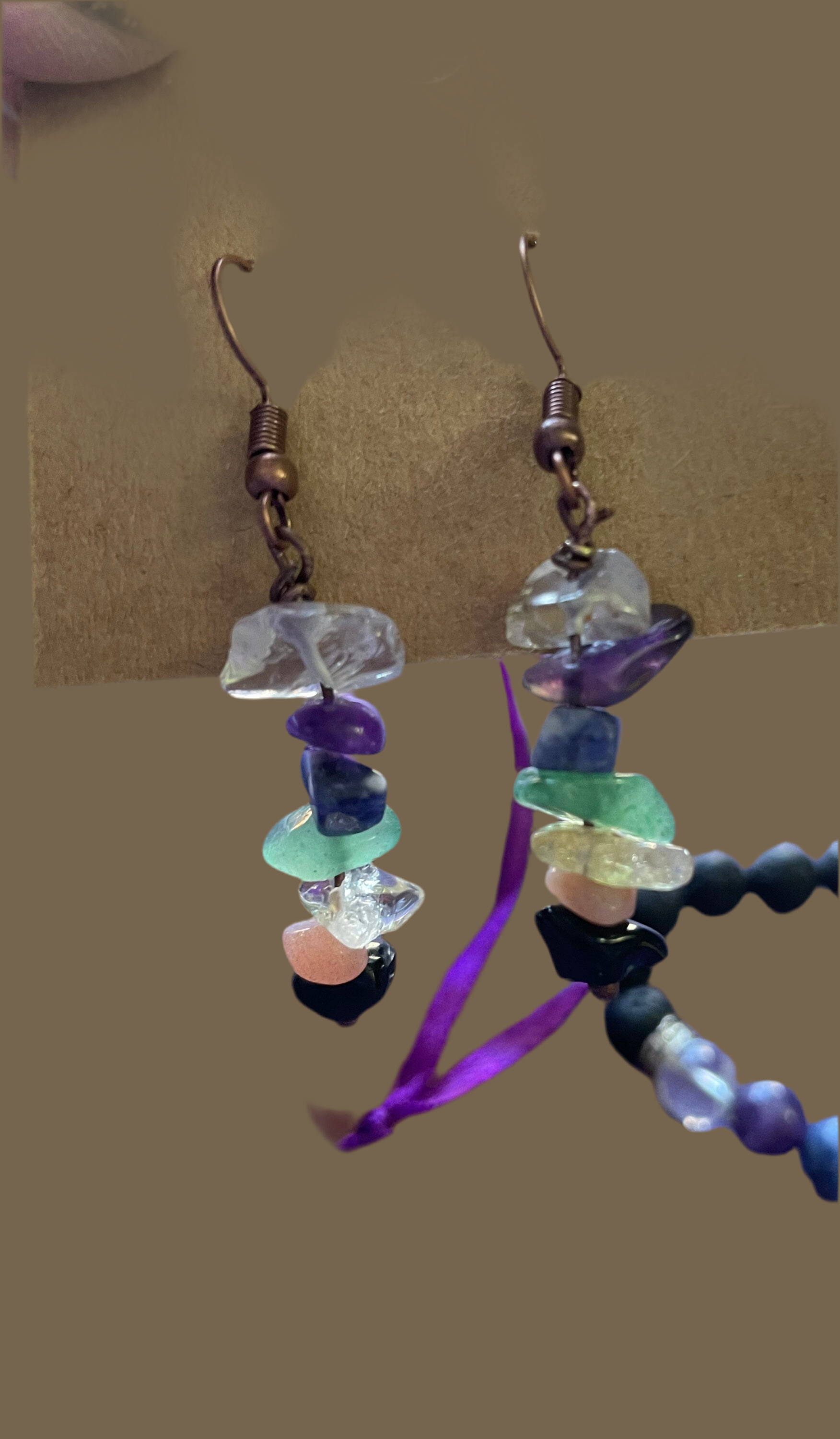Your earrings have been created with: Clear Quartz – Crown Chakra – 7th Purple Amethyst – 3rd Eye Chakra – 6th Blue Sodalite – Throat Chakra – 5th Aventurine – Heart Chakra -4th Citrine – Solar Plexus Chakra – 3rd Orange Carnelian – Sacral Hara Chakra – 2nd Snowflake Obsidian – Root Chakra – 1st