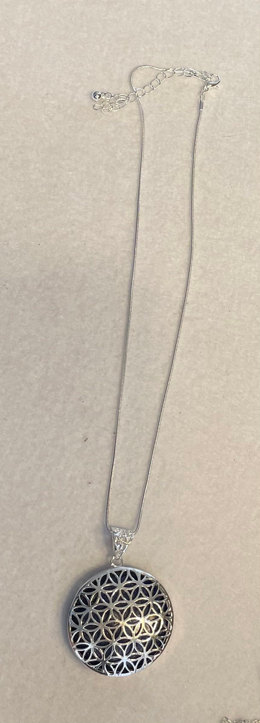Silver round Flower of Life deep purple Amethyst crystal necklace on 16+ inch silver plated chain From this silver plated chain hangs a beautiful flower of life Amethyst pendant. Amethyst is a powerful and protective stone. It guards against psychic attack, transmuting the energy into love and protecting the wearer from all types of harm, including geopathic or electromagnetic stress and ill wishes from others. Amethyst is a natural tranquilizer, it relieves stress and strain, soothes irritability, balances mood swings, dispels anger, rage, fear and anxiety. Alleviates sadness and grief, and dissolves negativity. Amethyst activates spiritual awareness, opens intuition and enhances psychic abilities. It has strong healing and cleansing powers. Amethyst encourages sobriety, having a sobering effect on overindulgence of alcohol, drugs or other addictions. It calms and stimulates the mind, helping you become more focused, enhancing memory and improving motivation. Amethyst assists in remembering and understanding dreams. It relieves insomnia. Encourages selflessness and spiritual wisdom. The chain is 16+ inches in length. You will also receive a crystal care and cleansing instruction sheet and your beautiful pendant will arrive safely in a pretty mesh pouch.