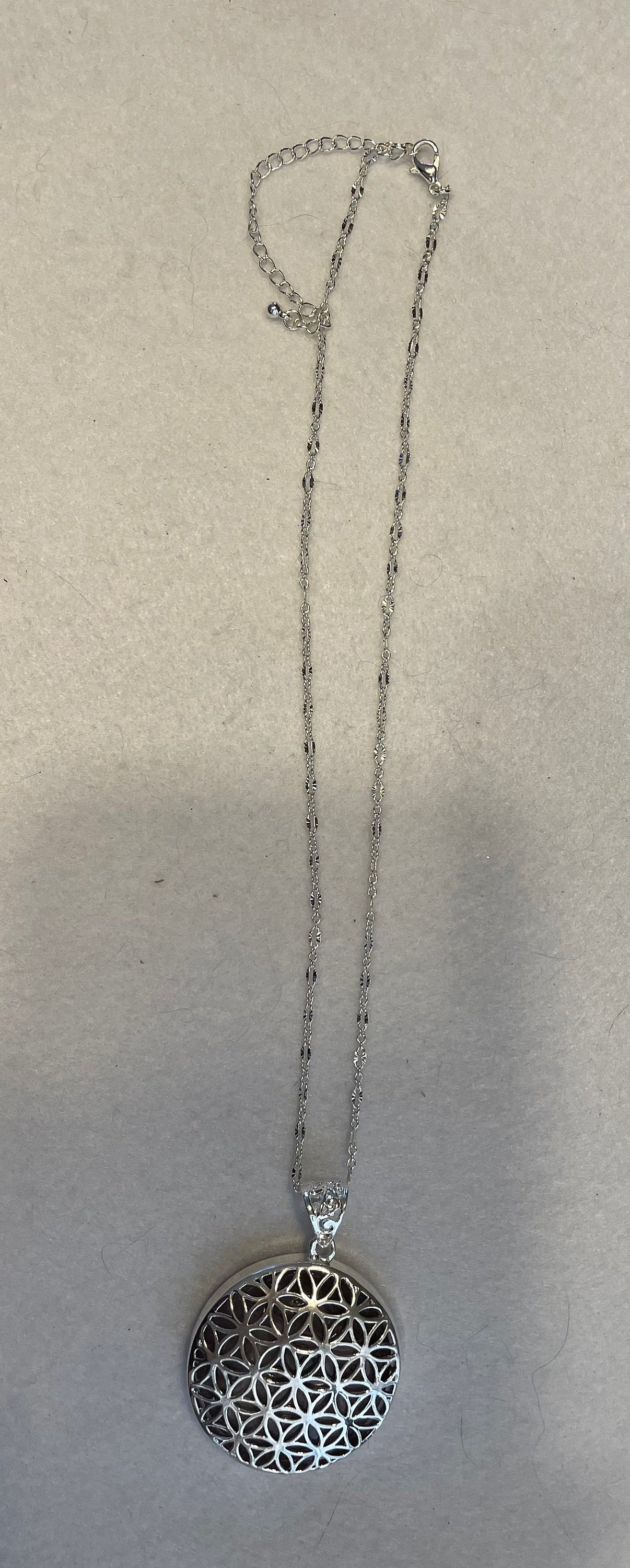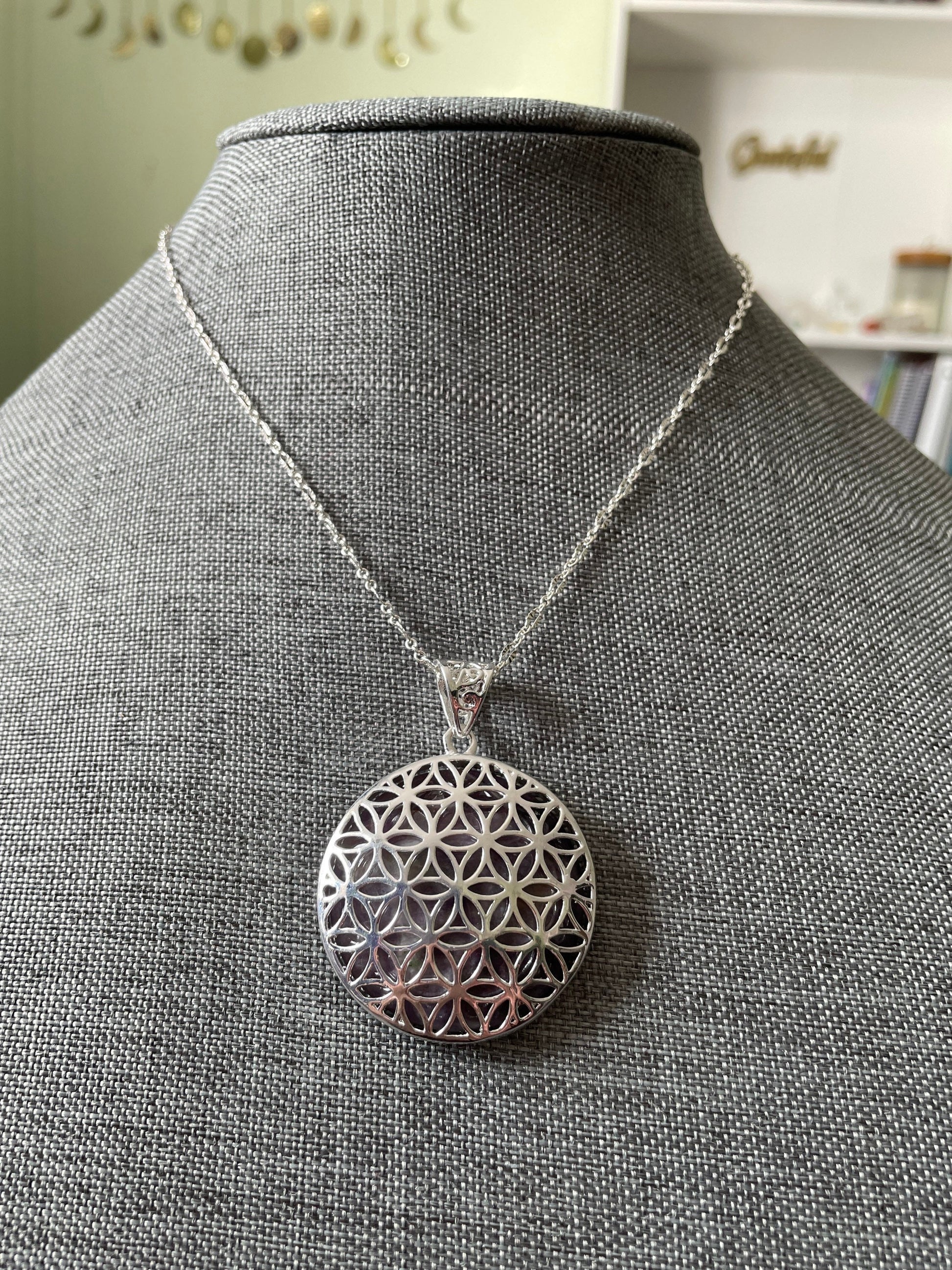 Silver round Flower of Life deep purple Amethyst crystal necklace on 16+ inch silver plated chain