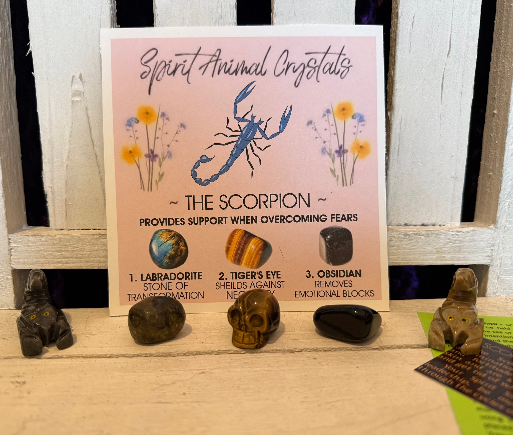 The scorpion represents overcoming fears. The crystals representing these properties are Labradorite, red Jasper, and obsidian. Your spirit animal comes in mesh pouch with a Spirit Animal information card. The 3 other crystals come a mesh pouch and are fully charged. These items, along with 5x5 decorative “Spirit Animal Crystals” card, crystal care and cleansing instructions are package in a clear resealable cellophane bag.