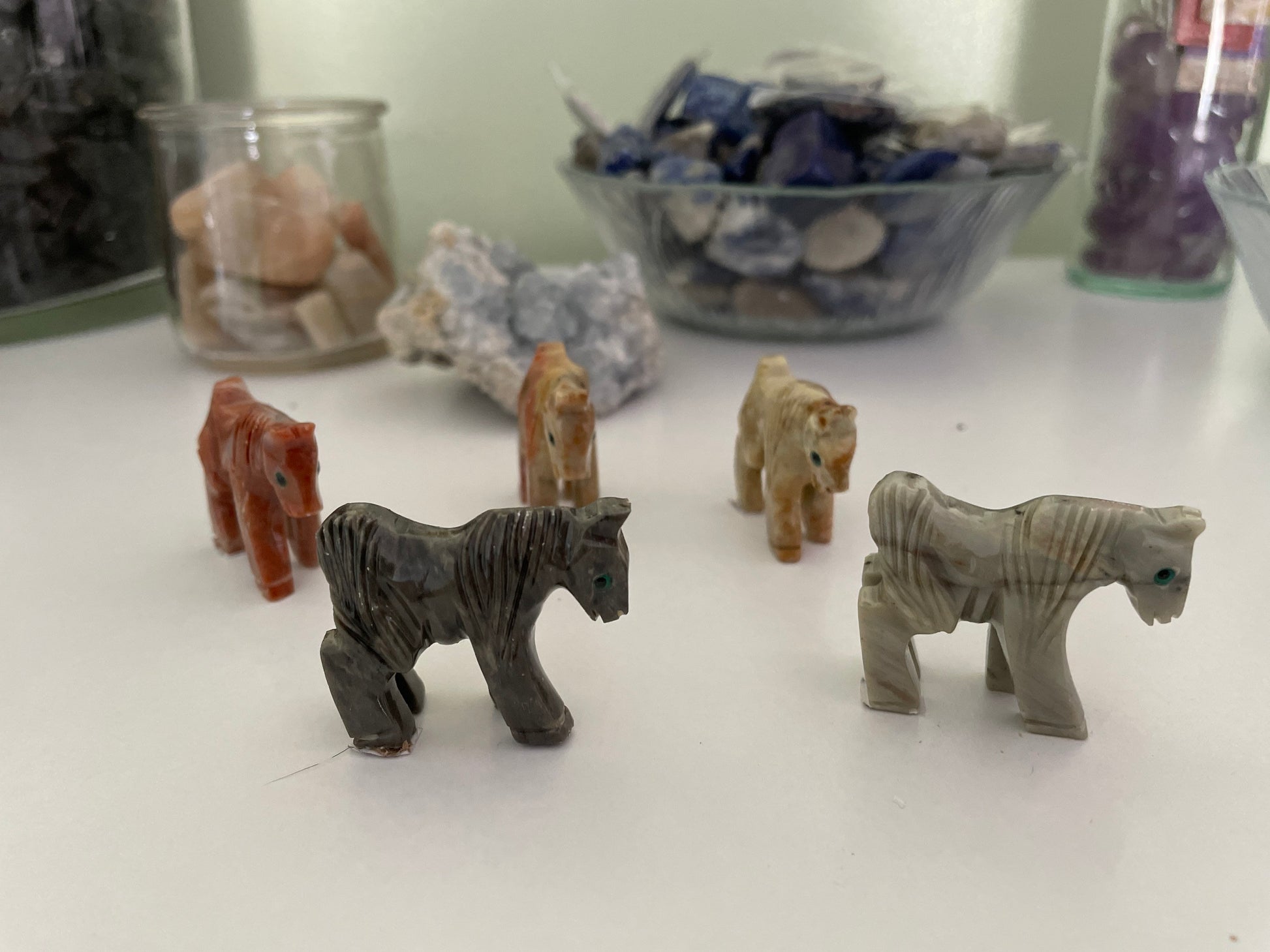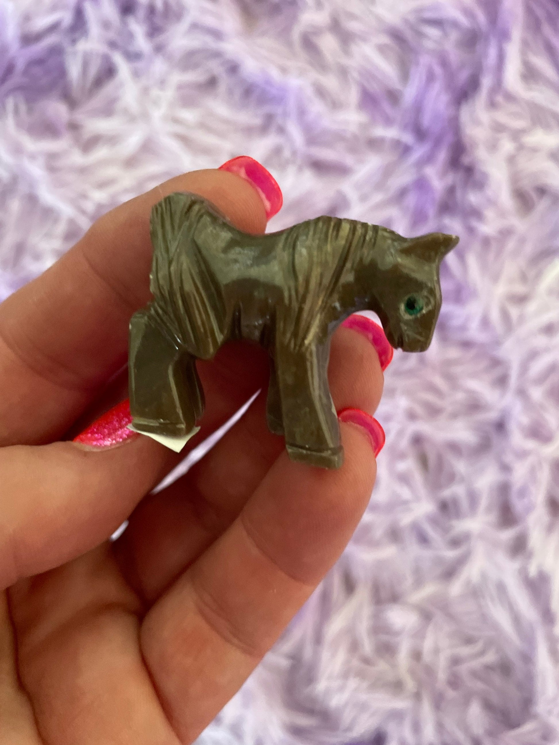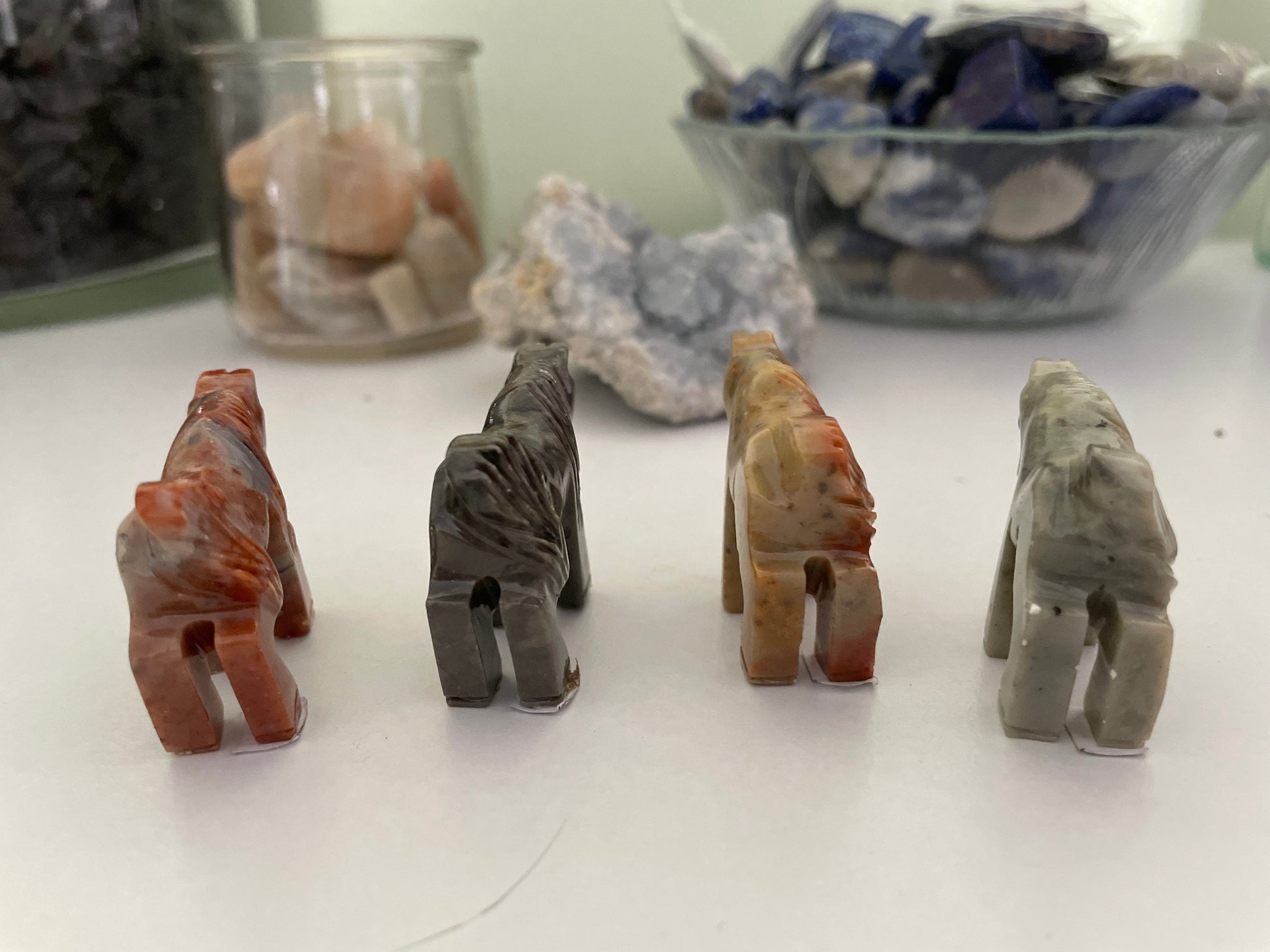 Spirit Animal Horse Dolomite Height in inches: 1 Width in Inches: 1.5 Made Of: Dolomite Symbol traditionally represents Strength. Your spirit animal comes in mesh pouch with a Spirit Animal information card, crystal care and cleansing instructions. Because they are a natural product, pieces vary in size and appearance.