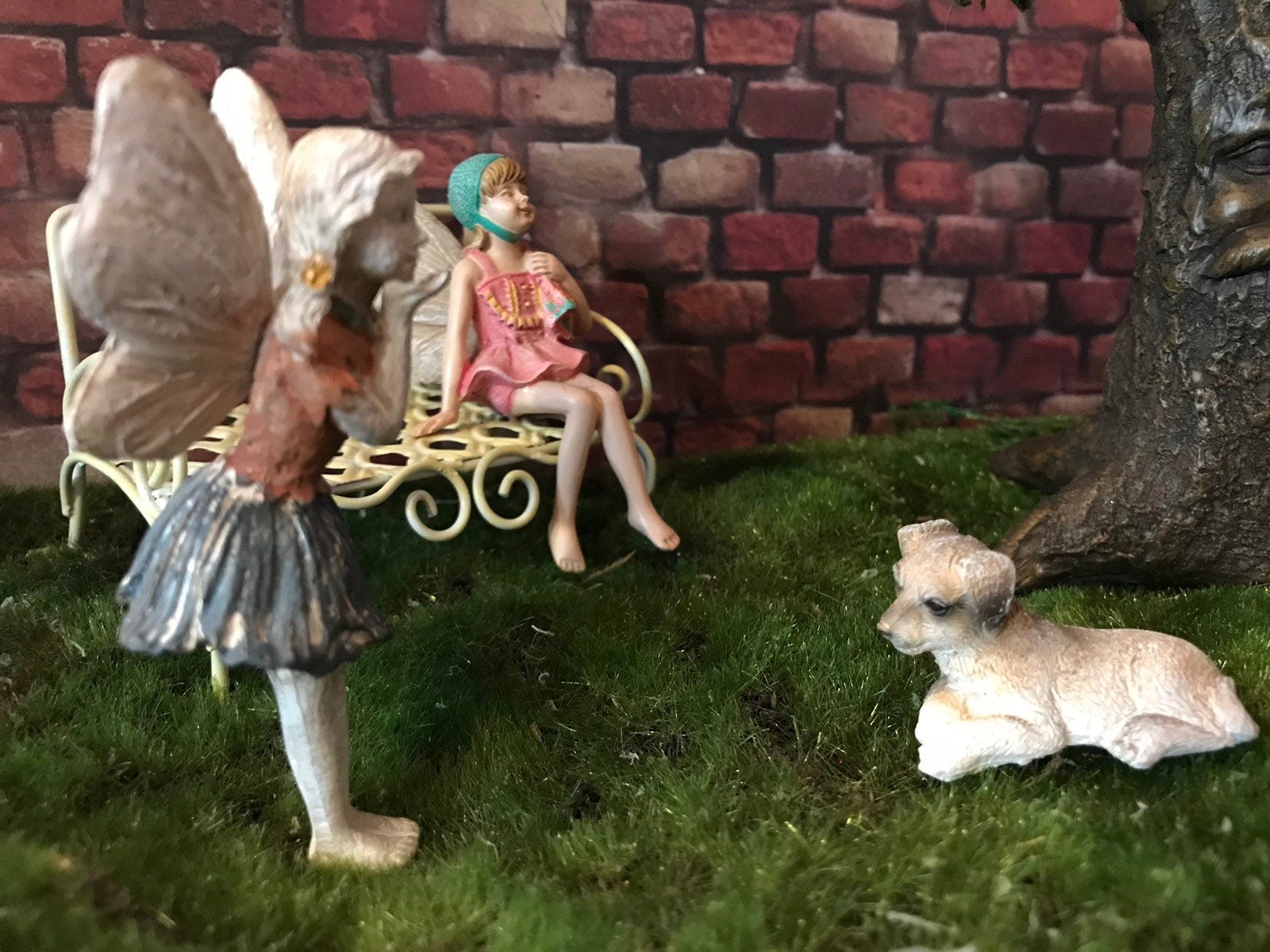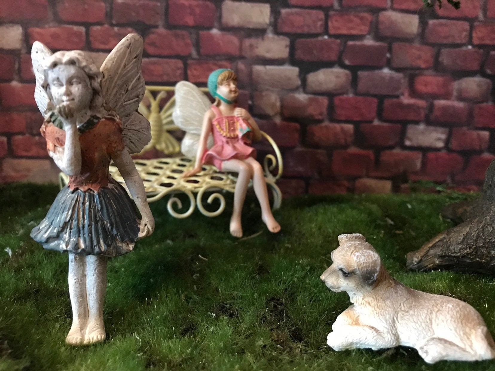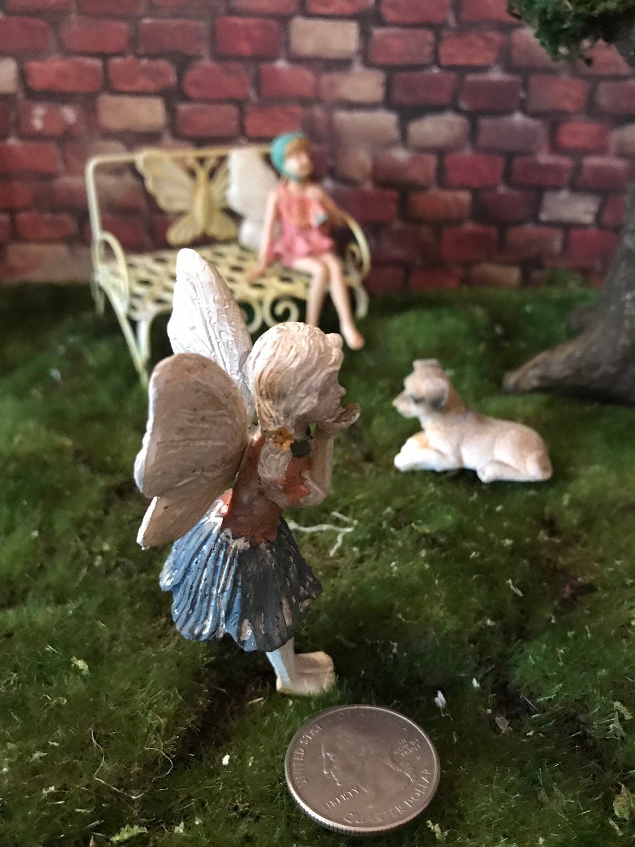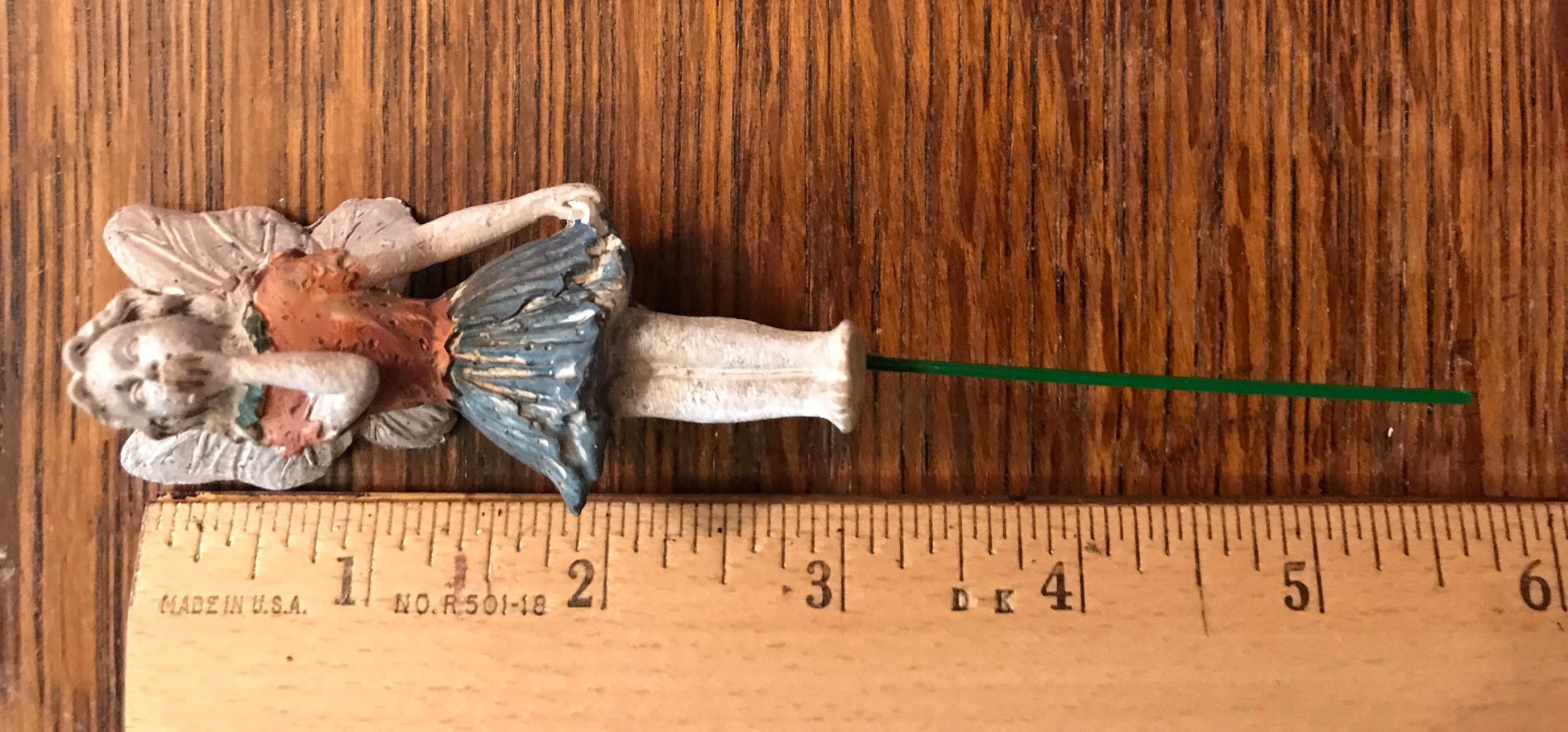 Sweet fairy girl is wearing an orange colored shirt and blue skirt. She is blowing a kiss to friends in your garden. She comes with a metal pick attached.