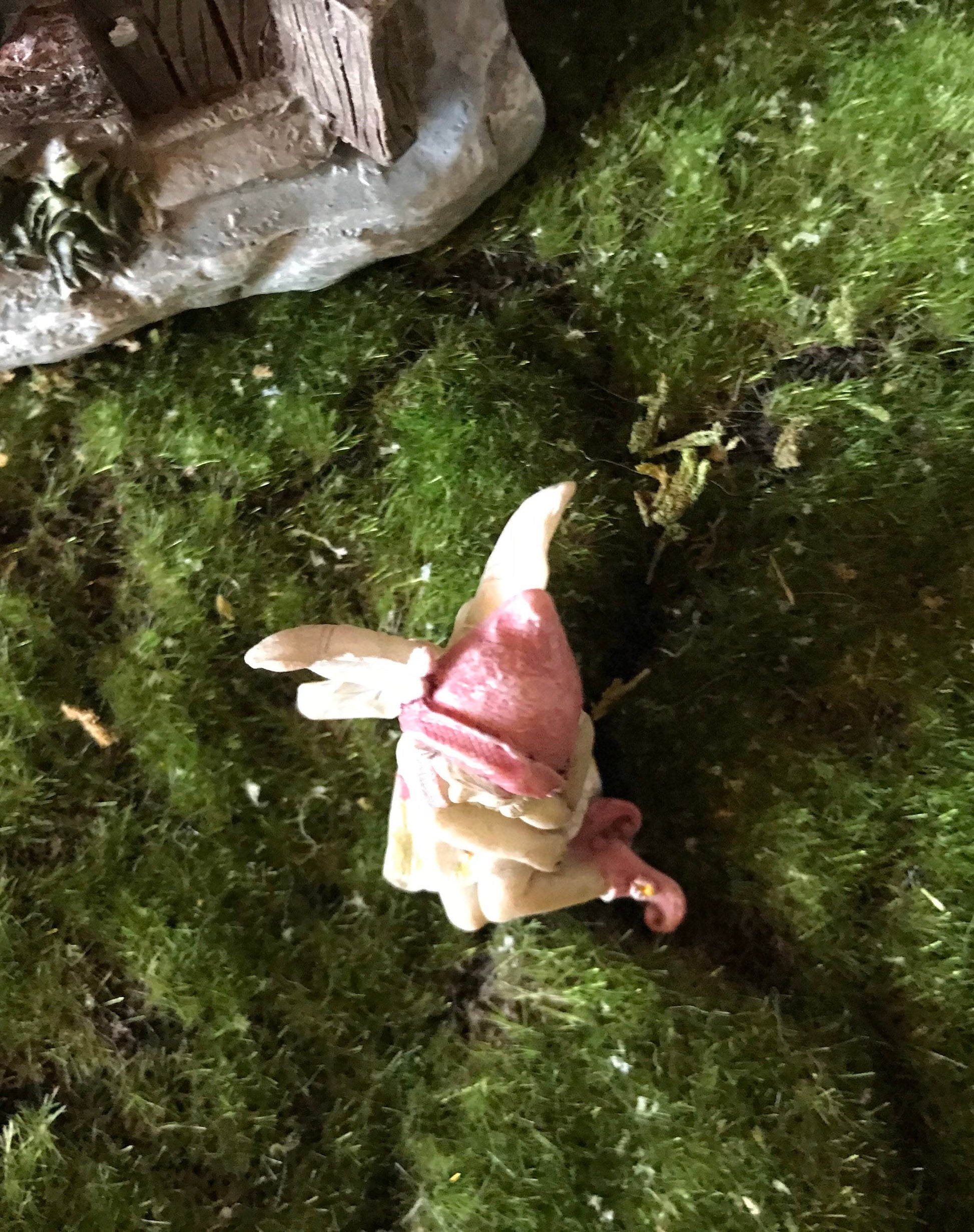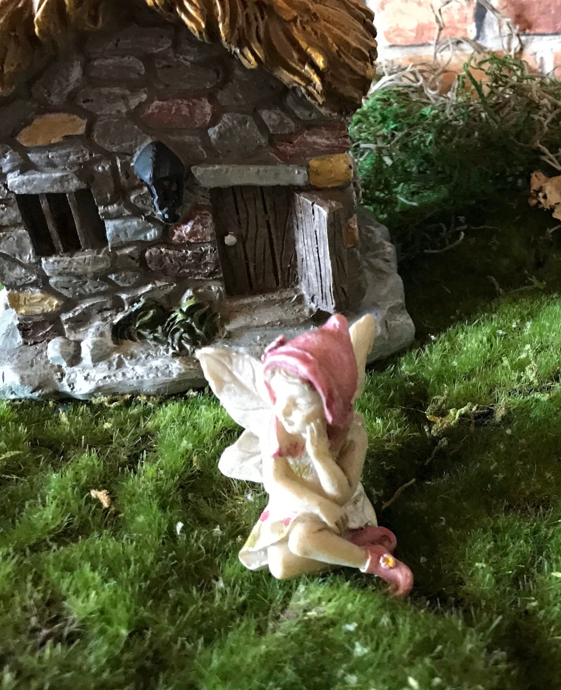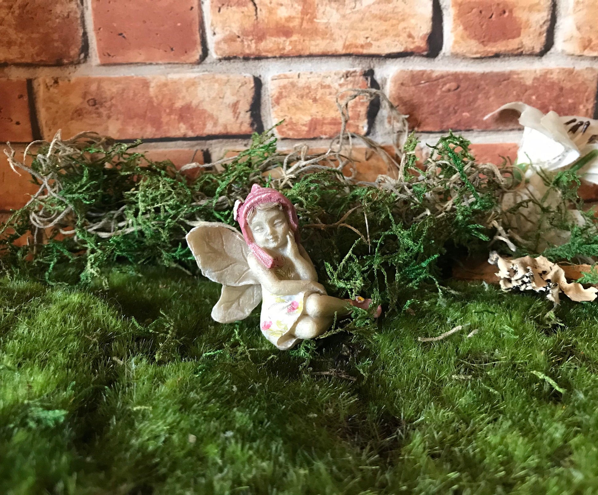 This Sweet fairy girl rests in the grass on a lovely summer day with her cute little pink hat pointed toward the sky. She adorns matching boots. Her dress has sweet pink flowers on it!