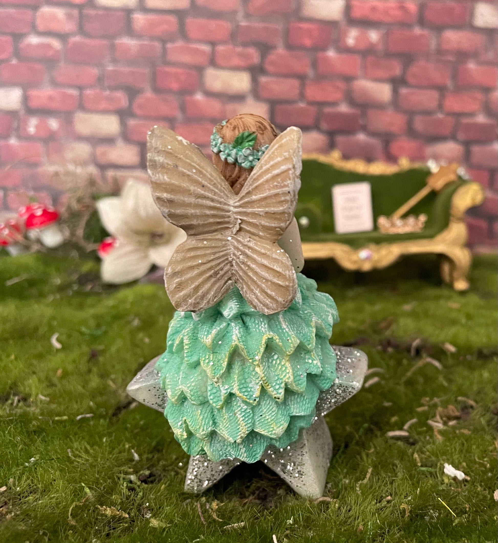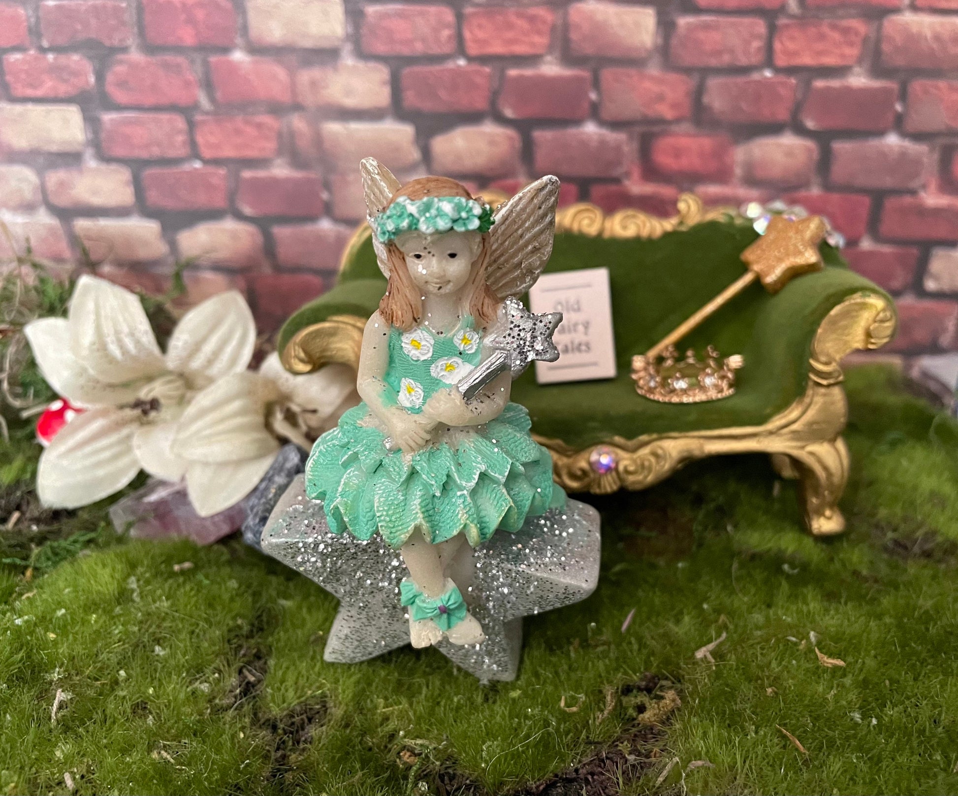 Magical fairy is wearing a beautiful, mint green dress with matching mint green bows on her ankles and a mint green flowery crown on her head. She sits sweetly sitting upon a glittery star and holds a glittery magic wand.