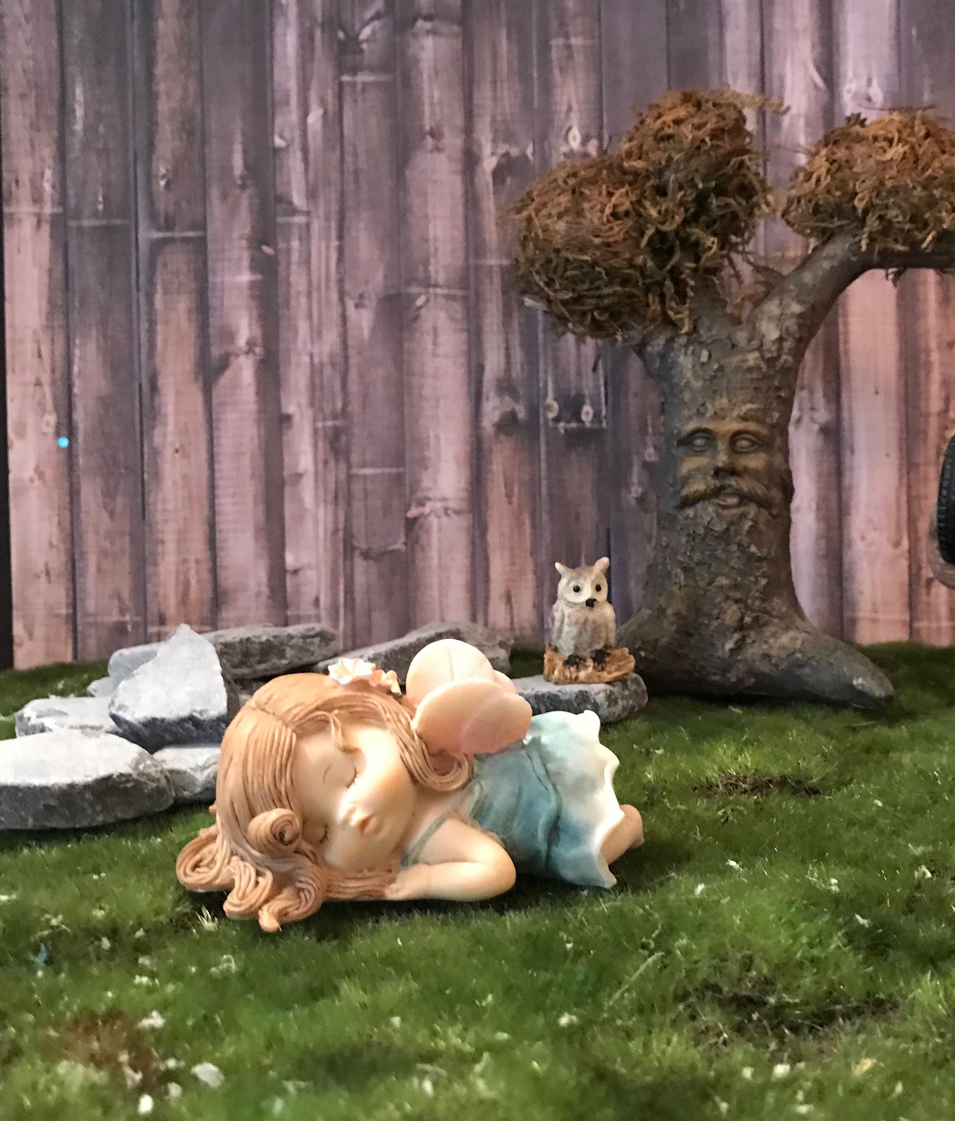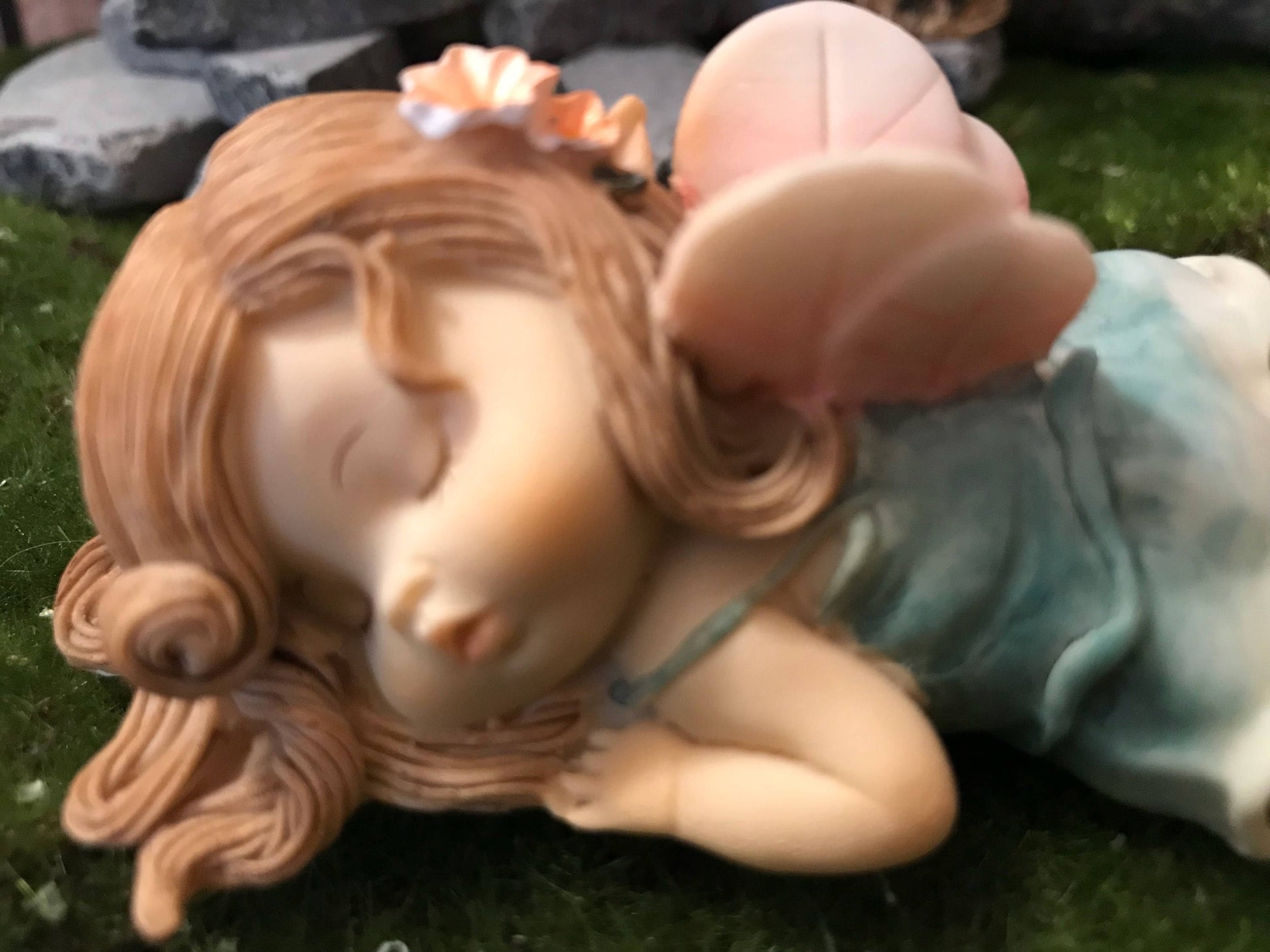 Just look at this precious face! I love this pretty fairy. She is laying sweetly in the grass. Her brown hair dangles down around her and is decorated with 2 tiny flowers. Her tiny pointed ears are poking out from her hair. The strap of her blue dress slips down her shoulders and her pretty pink bloomers show from beneath.
