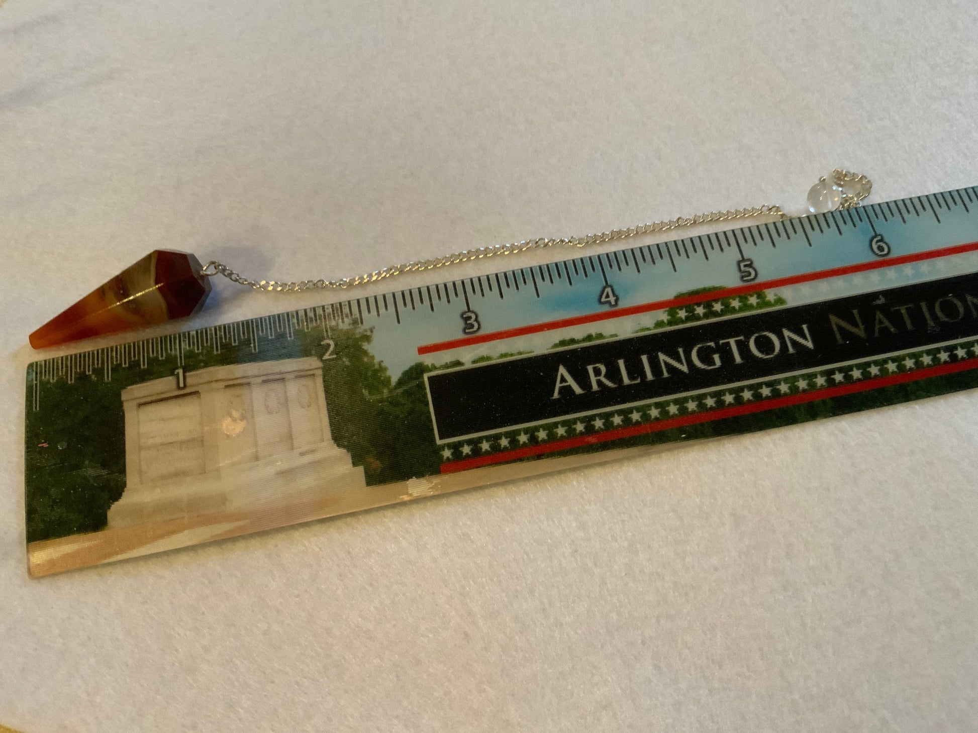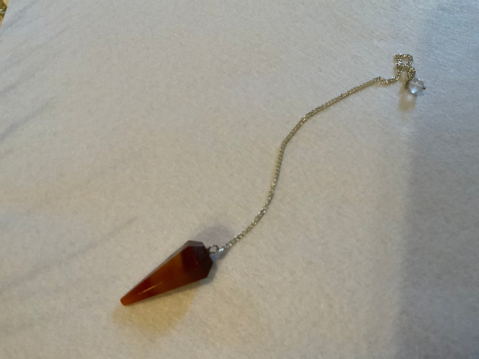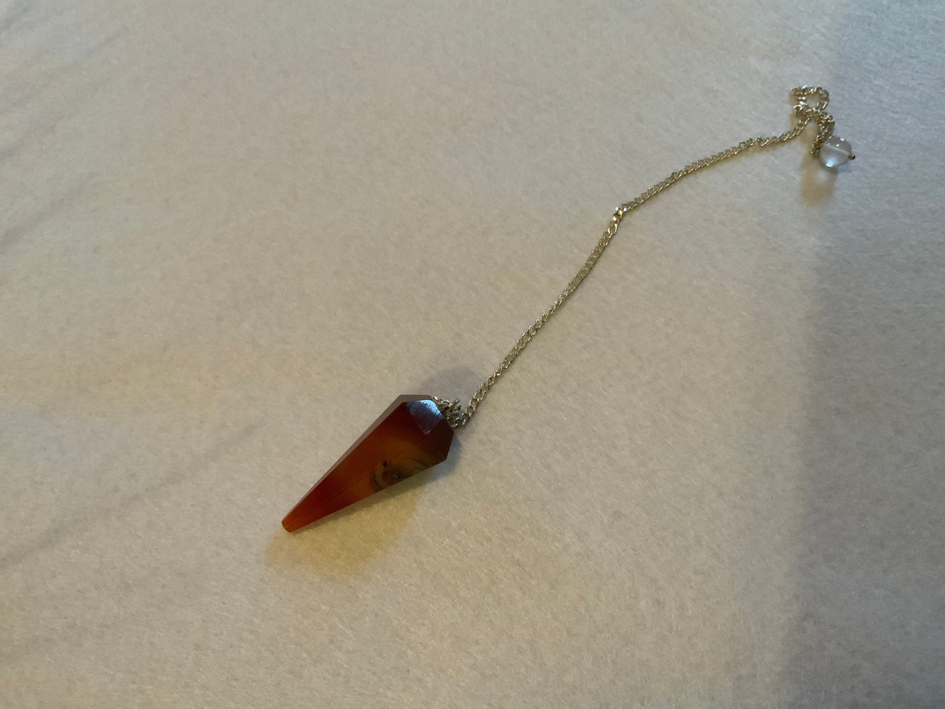 This beautiful Carnelian Pendulum is 1.25” and with the chain it is 9” Please look at all pictures to see all sides of this pendulum.