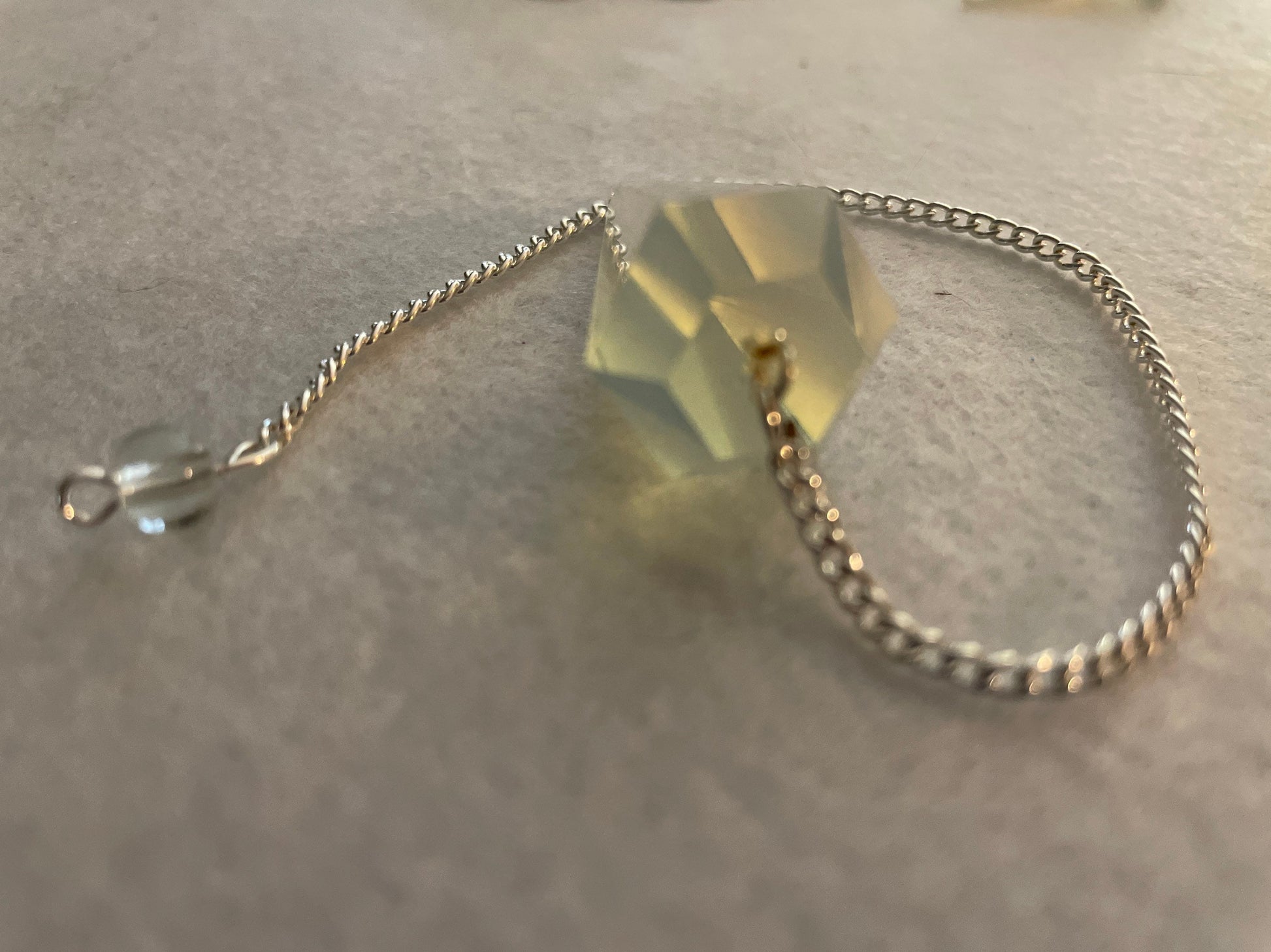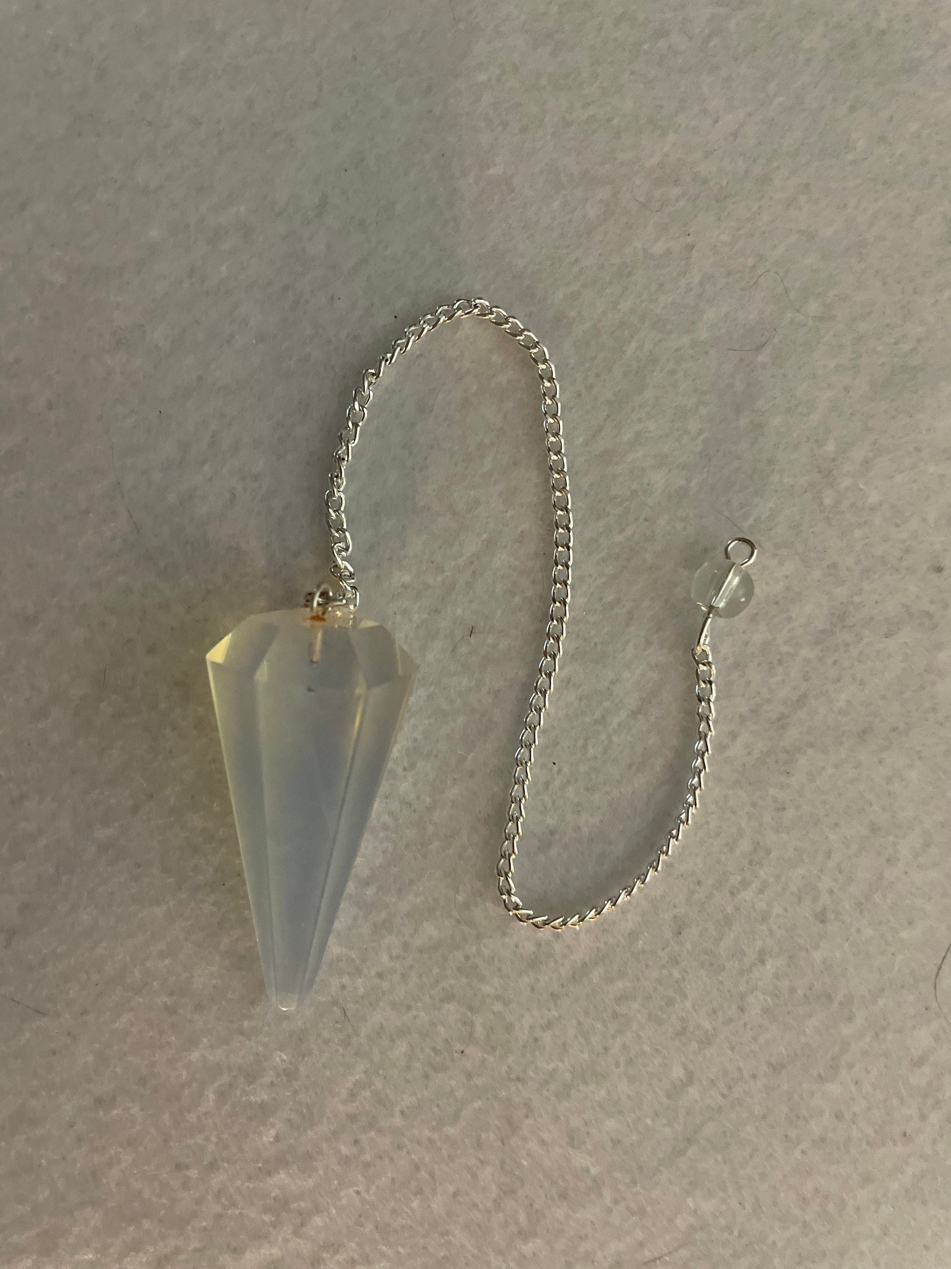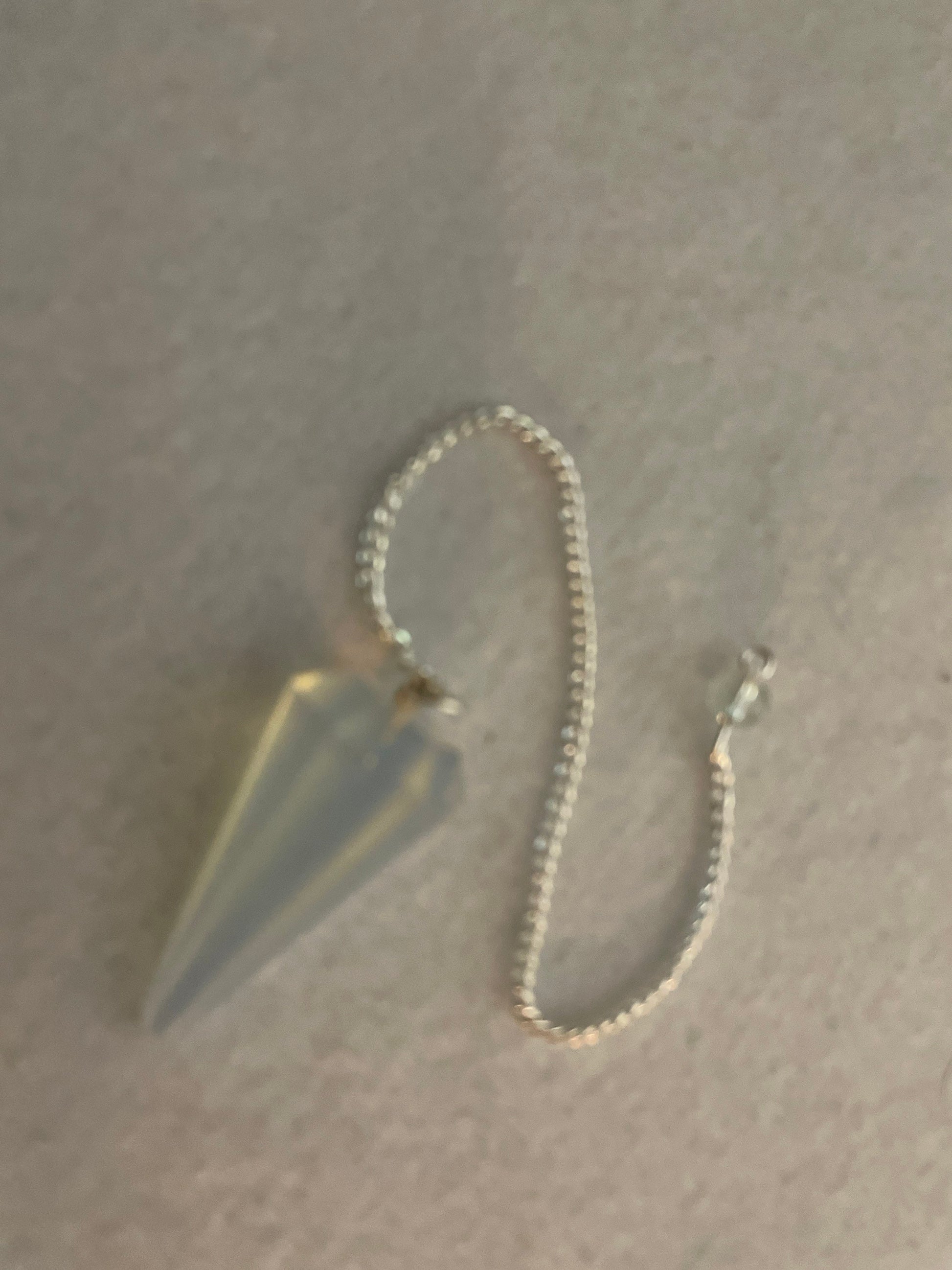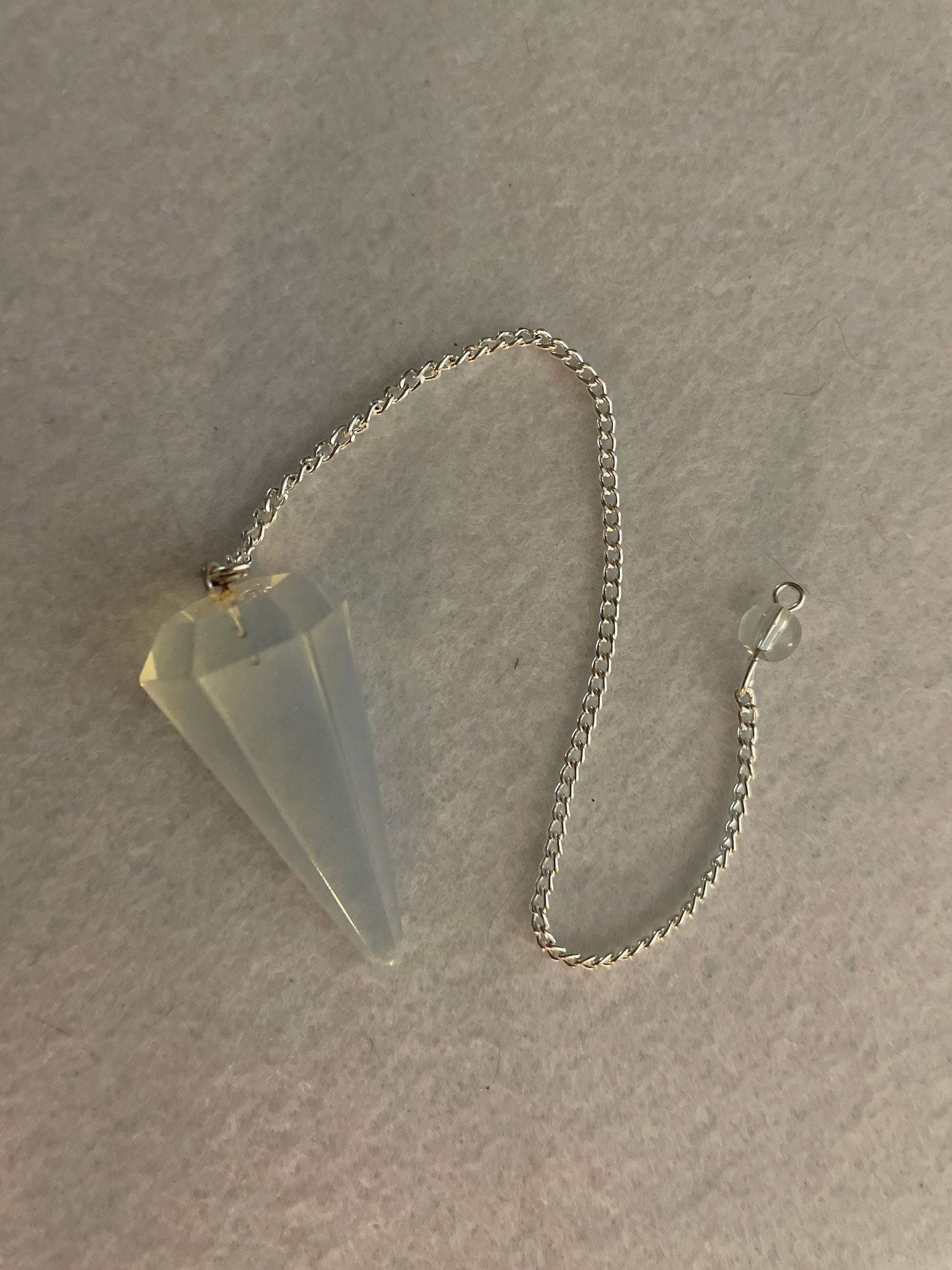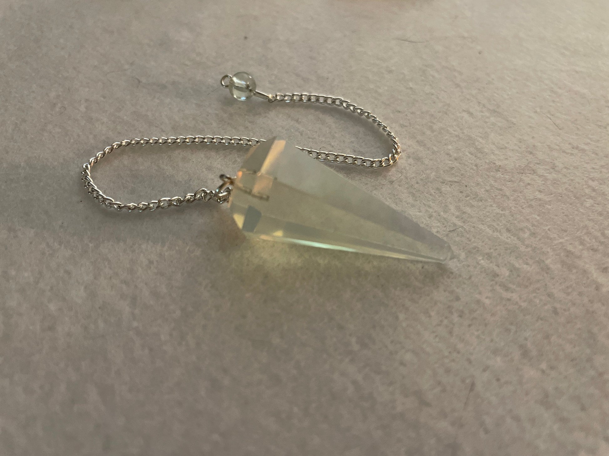 This beautiful Opalite pendulum is approximately 1.65” and with chain is 8.5”