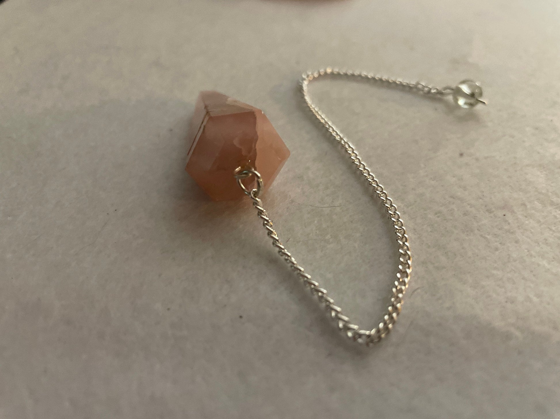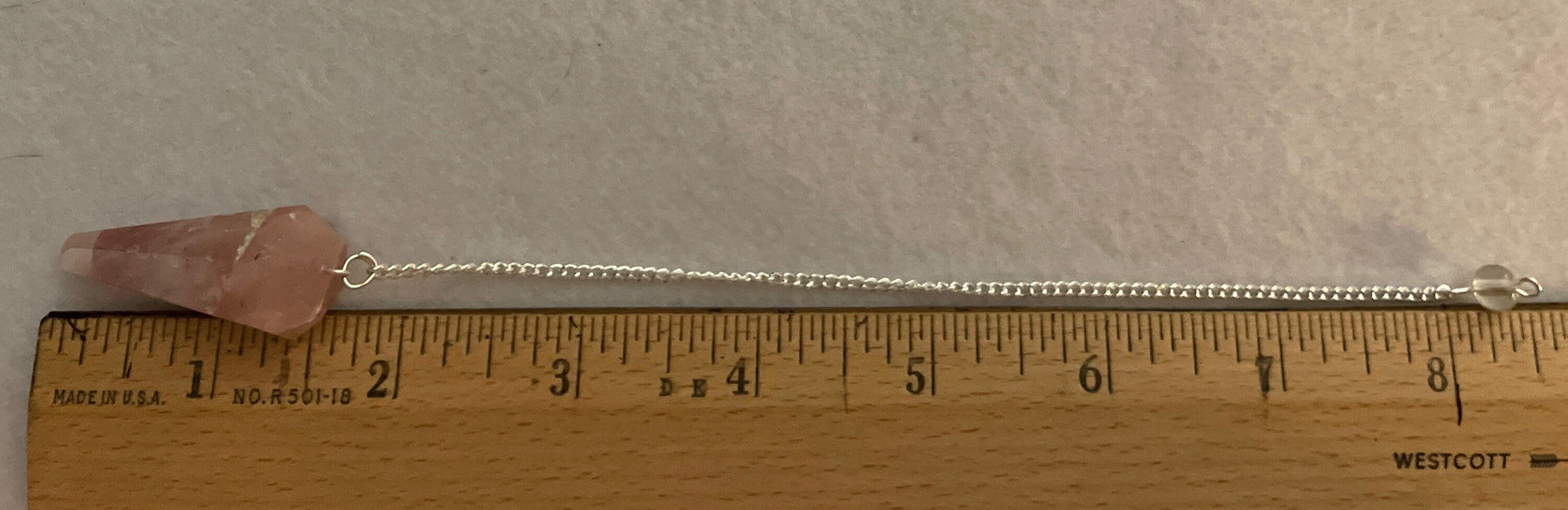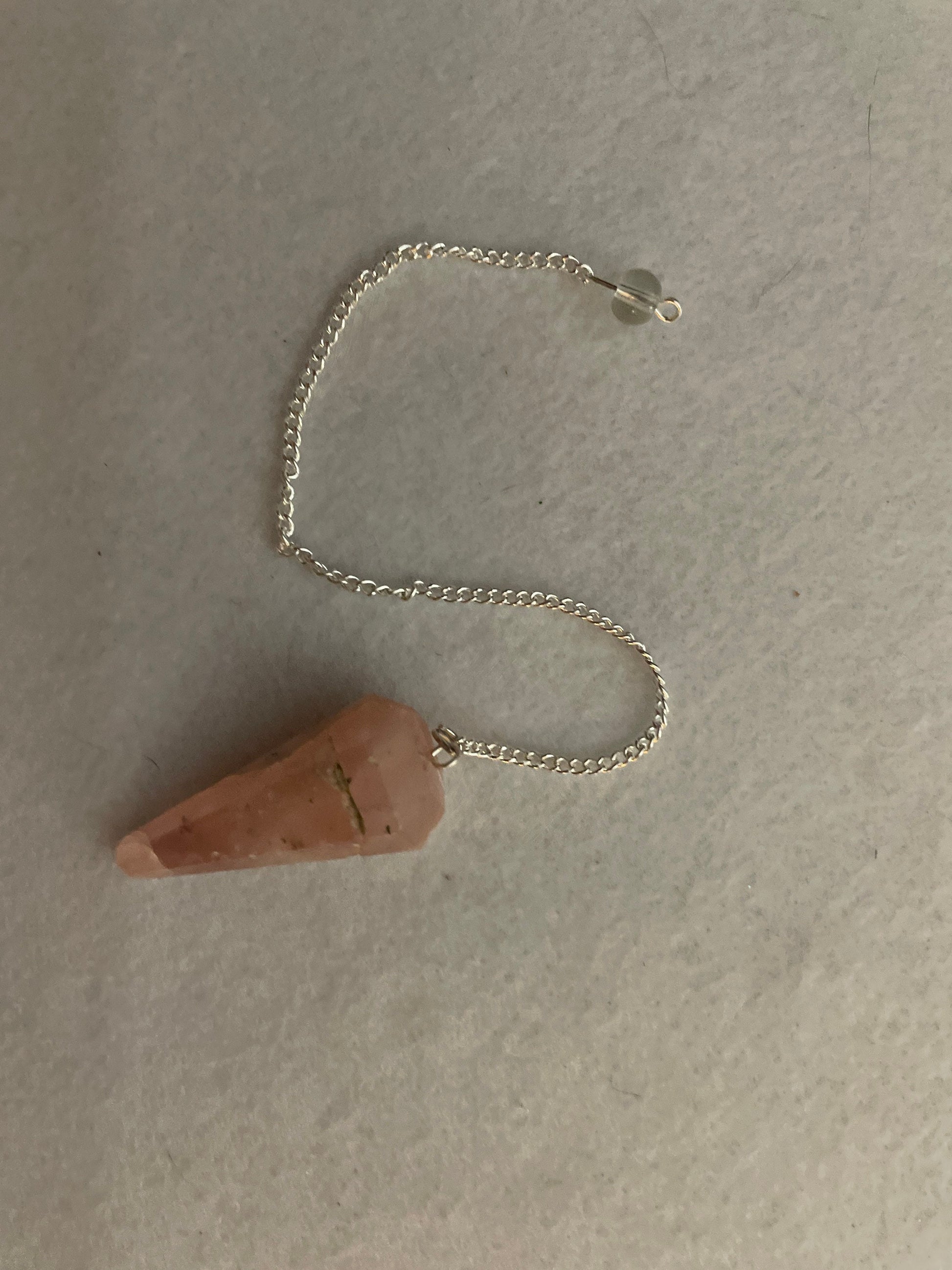 This beautiful Rose Quartz Pendulum is 1.65” and with chain is 8”.