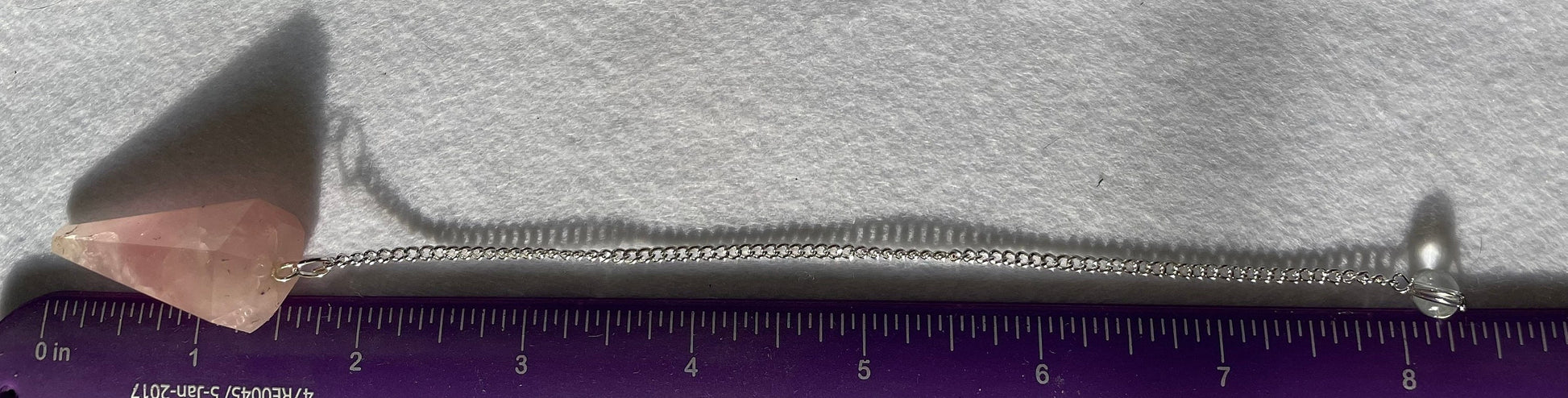 This beautiful Rose Quartz Pendulum is 1.65” and with chain is 8.5”. Please look at all pictures to see all sides of this pendulum.