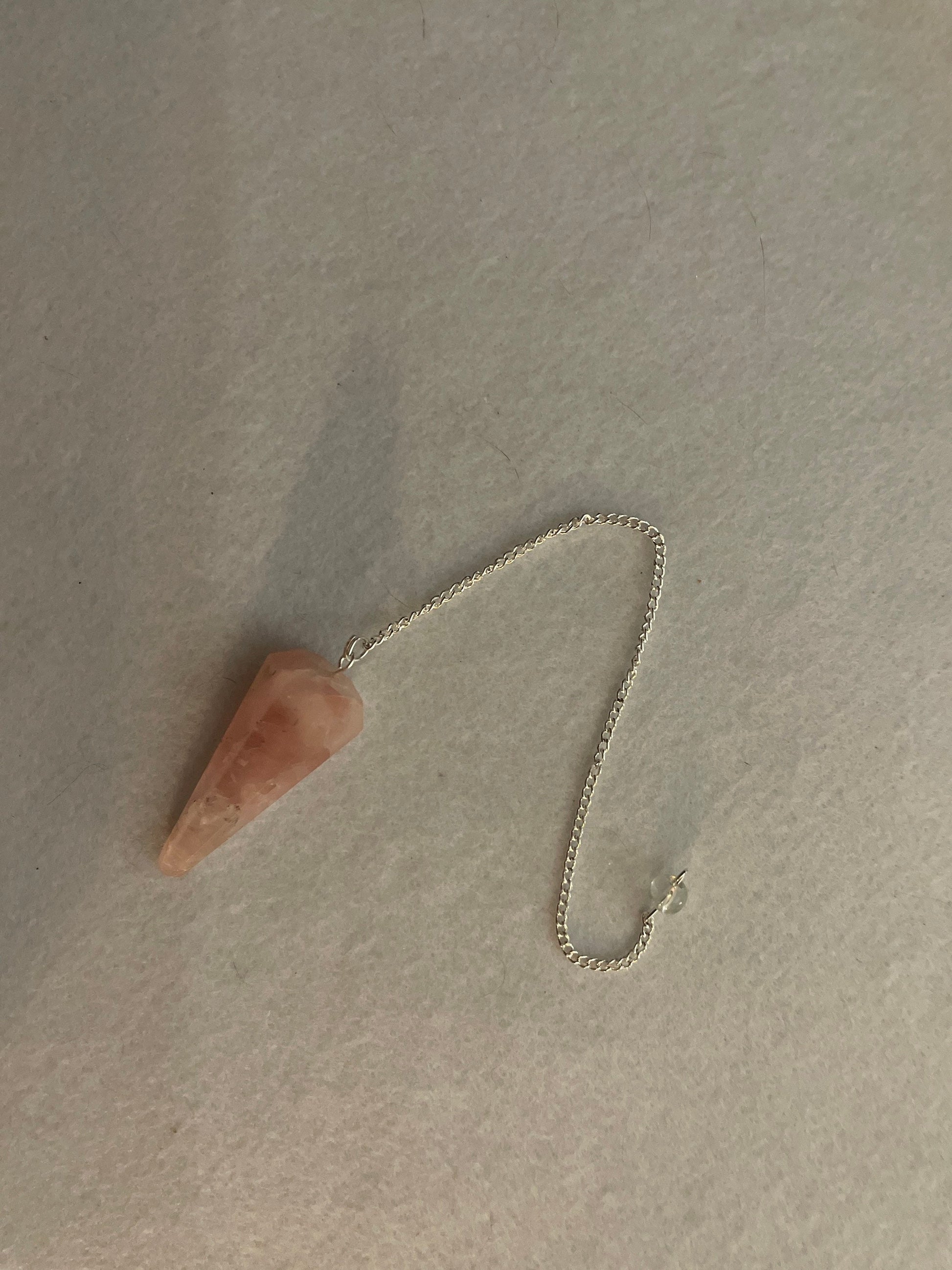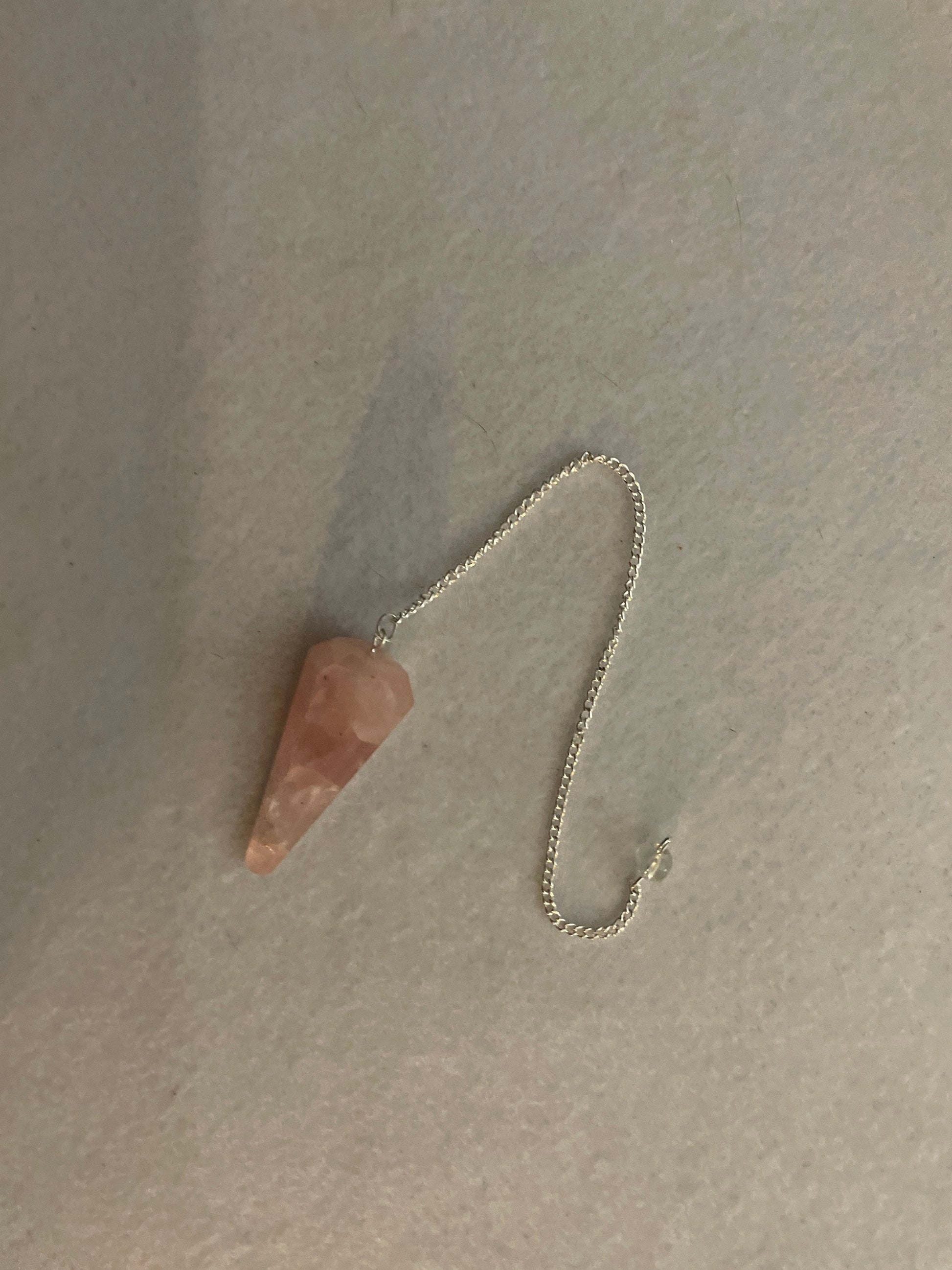 This beautiful Rose Quartz Pendulum is 1.75” and with chain is 8.25”