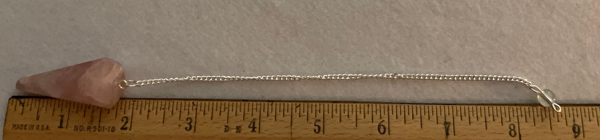 This beautiful Rose Quartz Pendulum is 1.75” and with chain is 8.25”. Please look at all pictures to see all sides of this pendulum.
