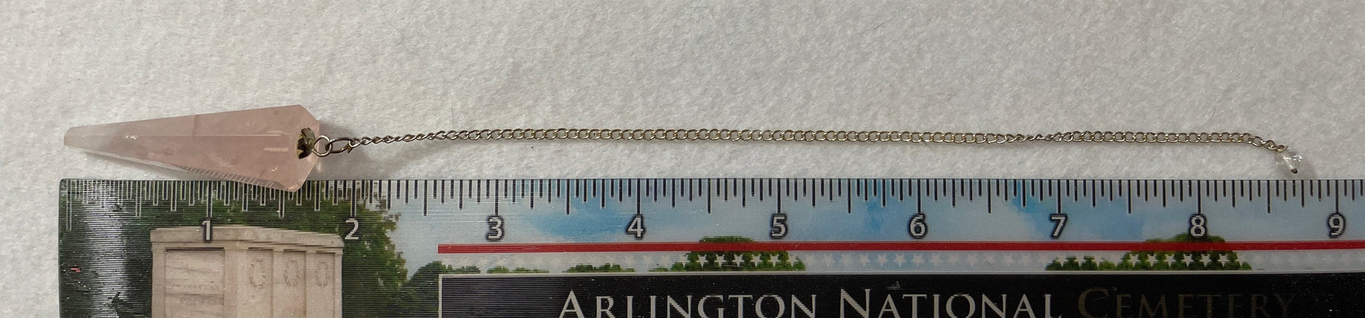 This beautiful Rose Quartz Pendulum is 1.75” and with chain is 8.75”. Please look at all pictures to see all sides of this pendulum.