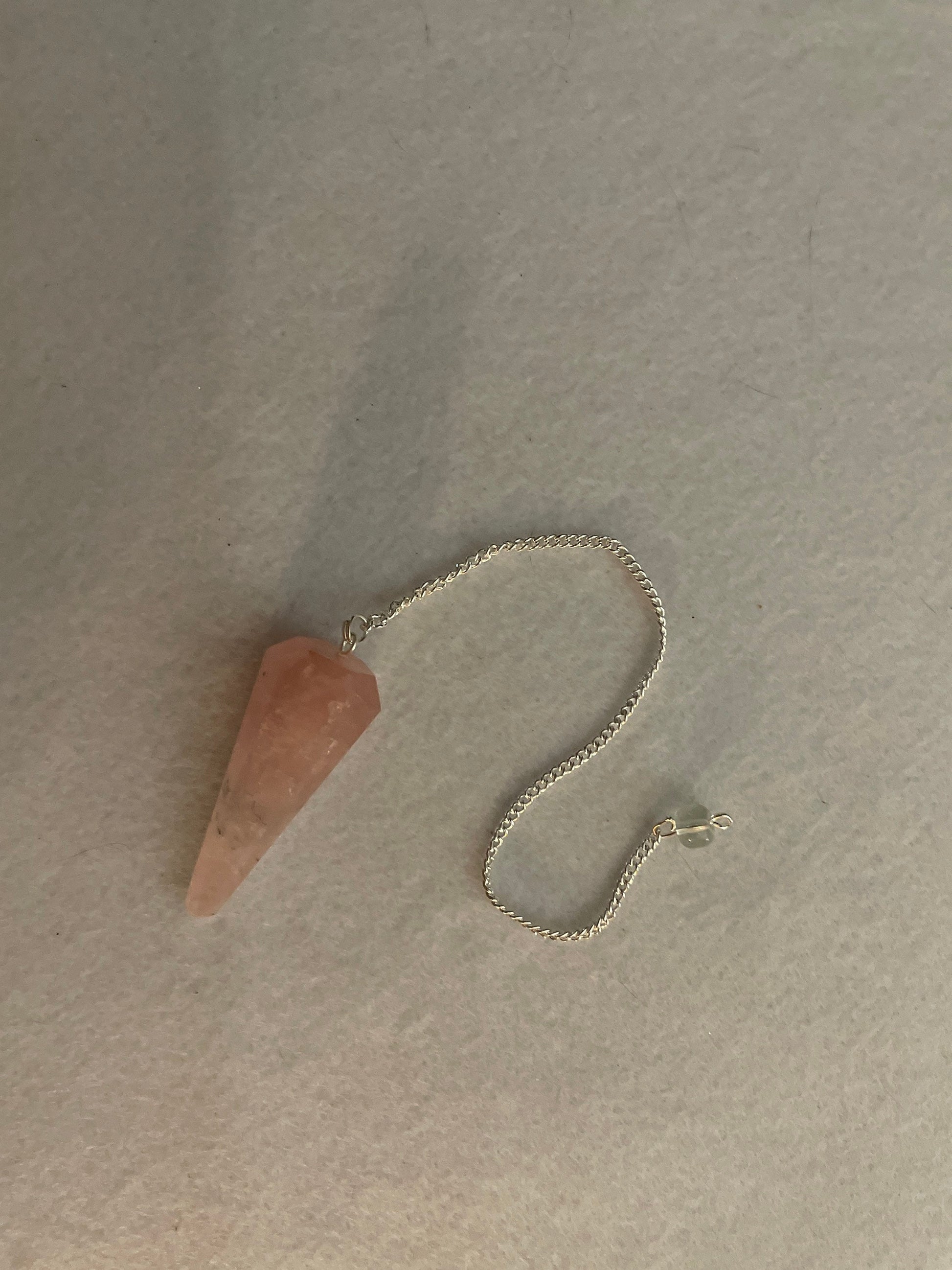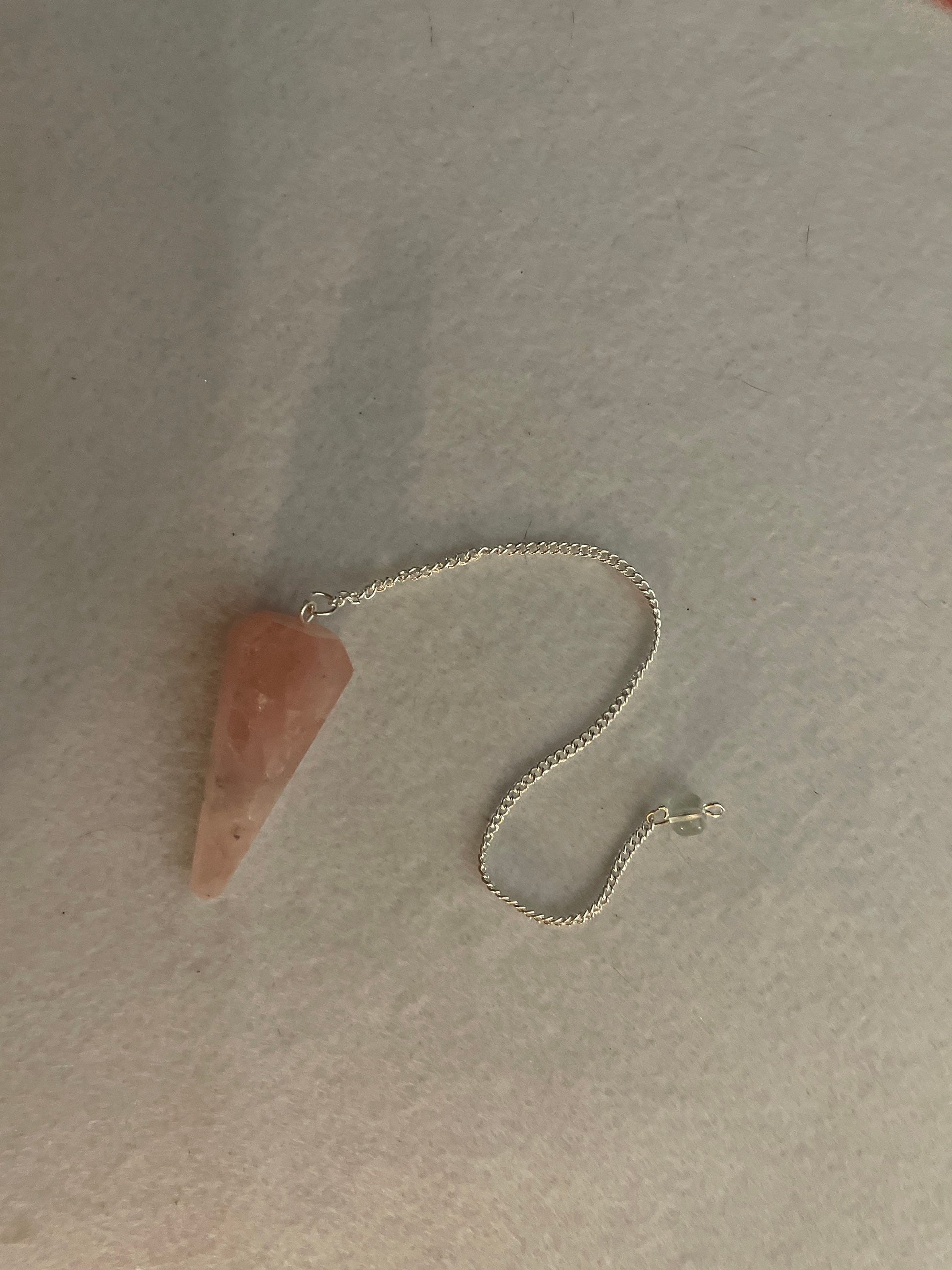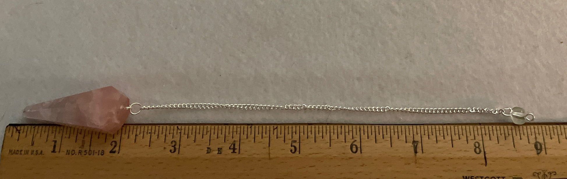 This beautiful Rose Quartz Pendulum is 1.85” and with chain is 8.25”