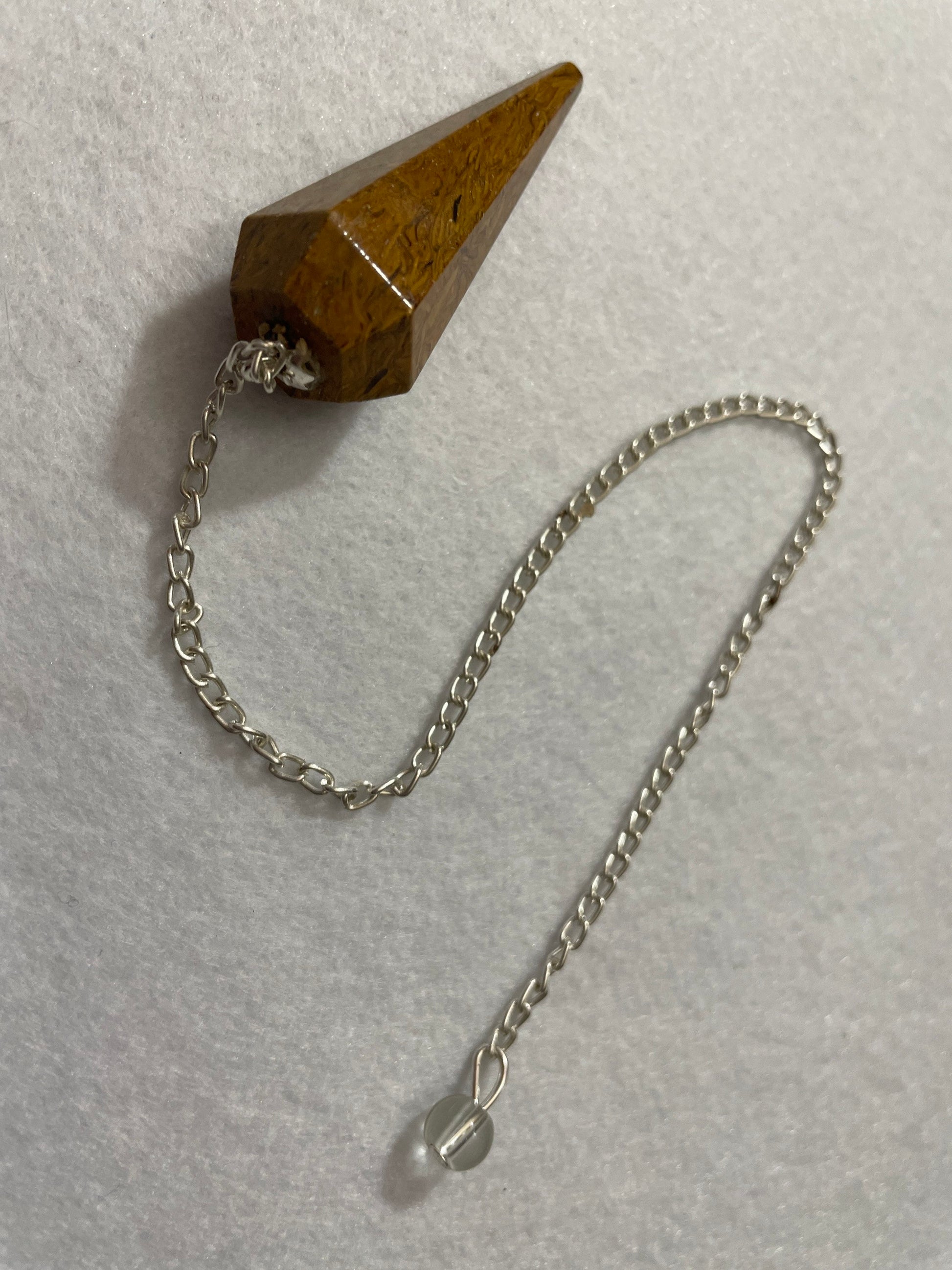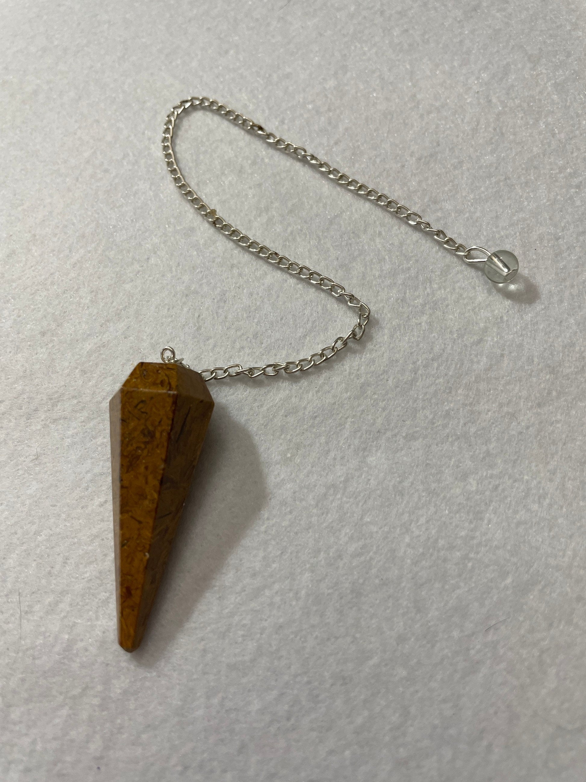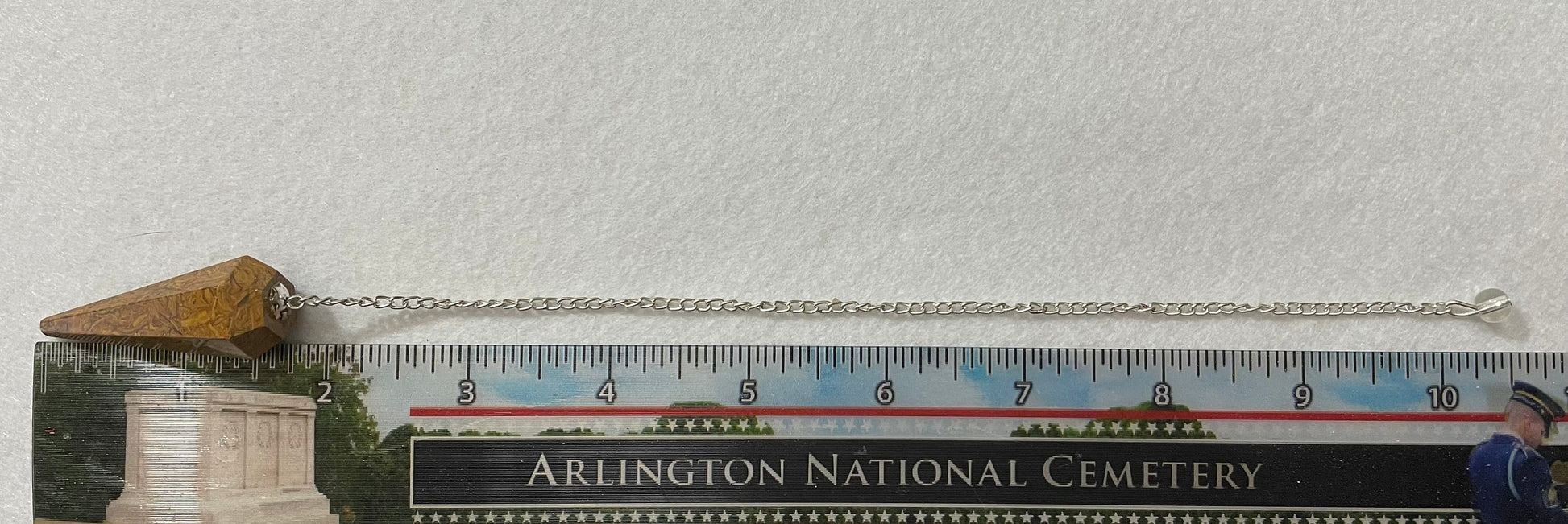 This beautiful Yellow Jasper Pendulum is 1.75” and with the chain it is approximately 10.5”. Please look at all pictures to see all sides of this pendulum.