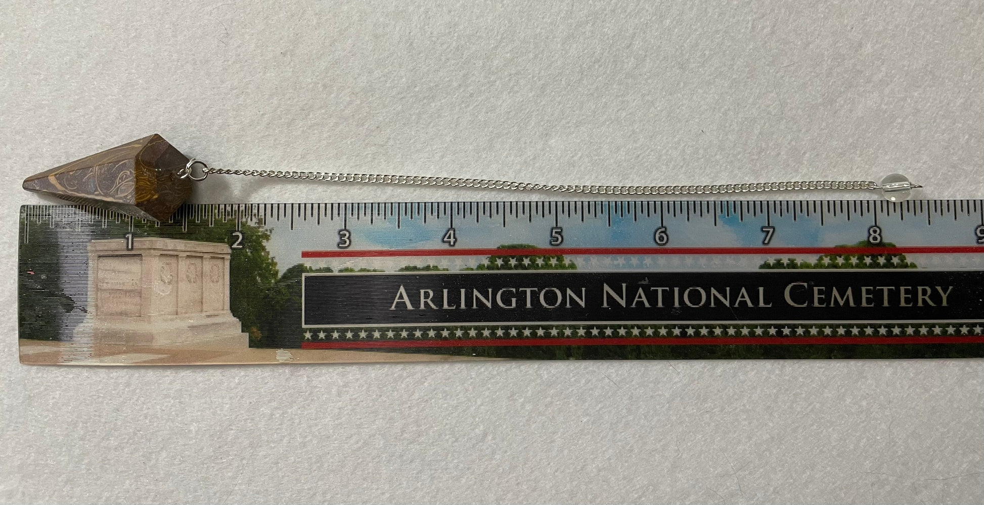 This Mariam Jasper Pendulum is 1.50” and with the chain is 8.25”. Please look at all pictures to see all sides of this pendulum.