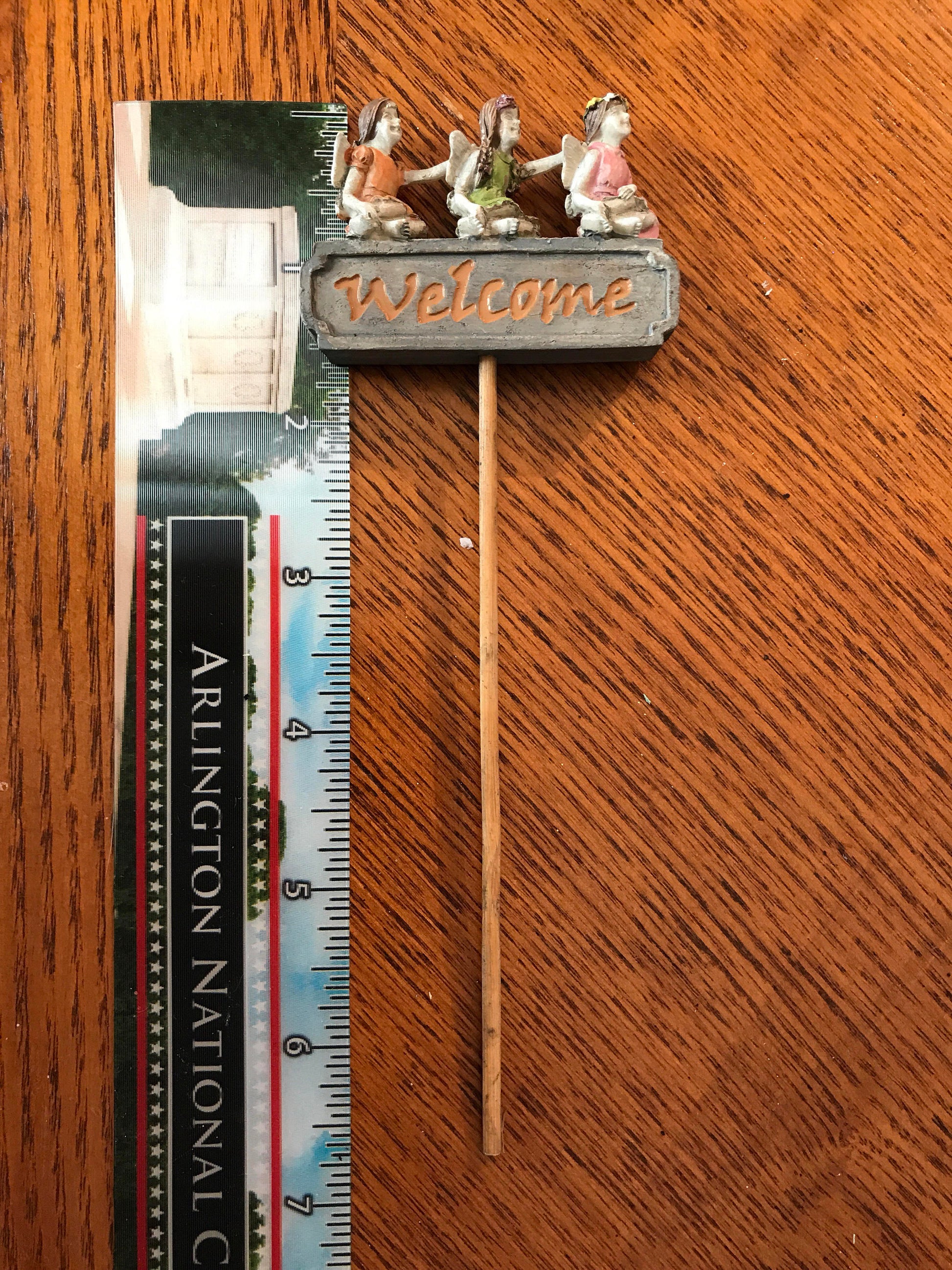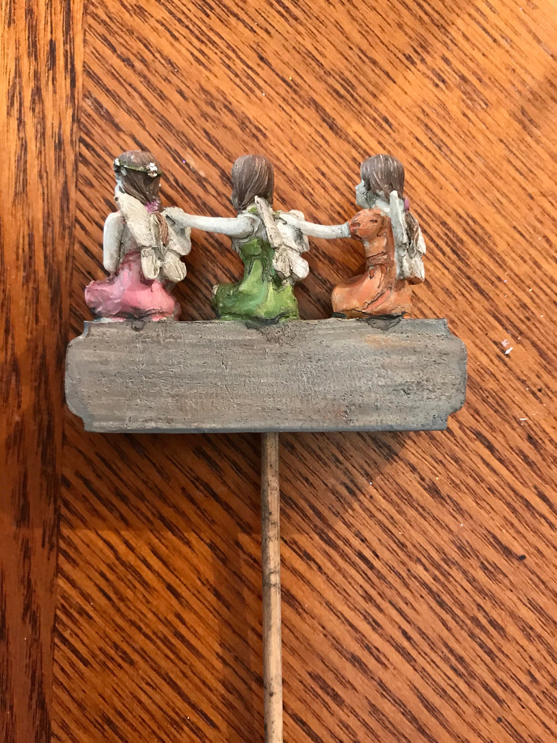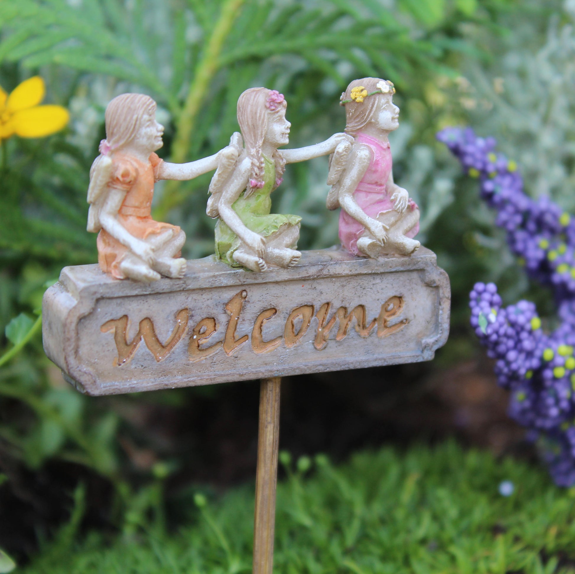 Three tiny fairies sitting upon a sign welcome you and your friends to your garden.