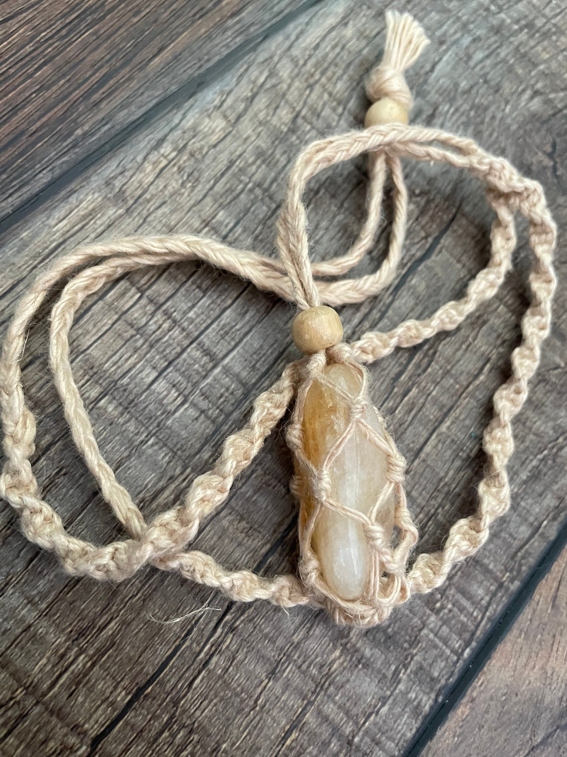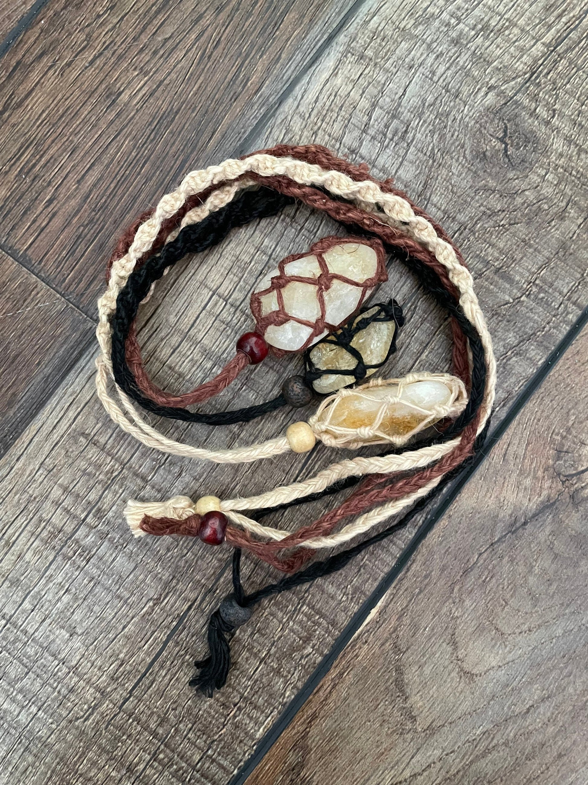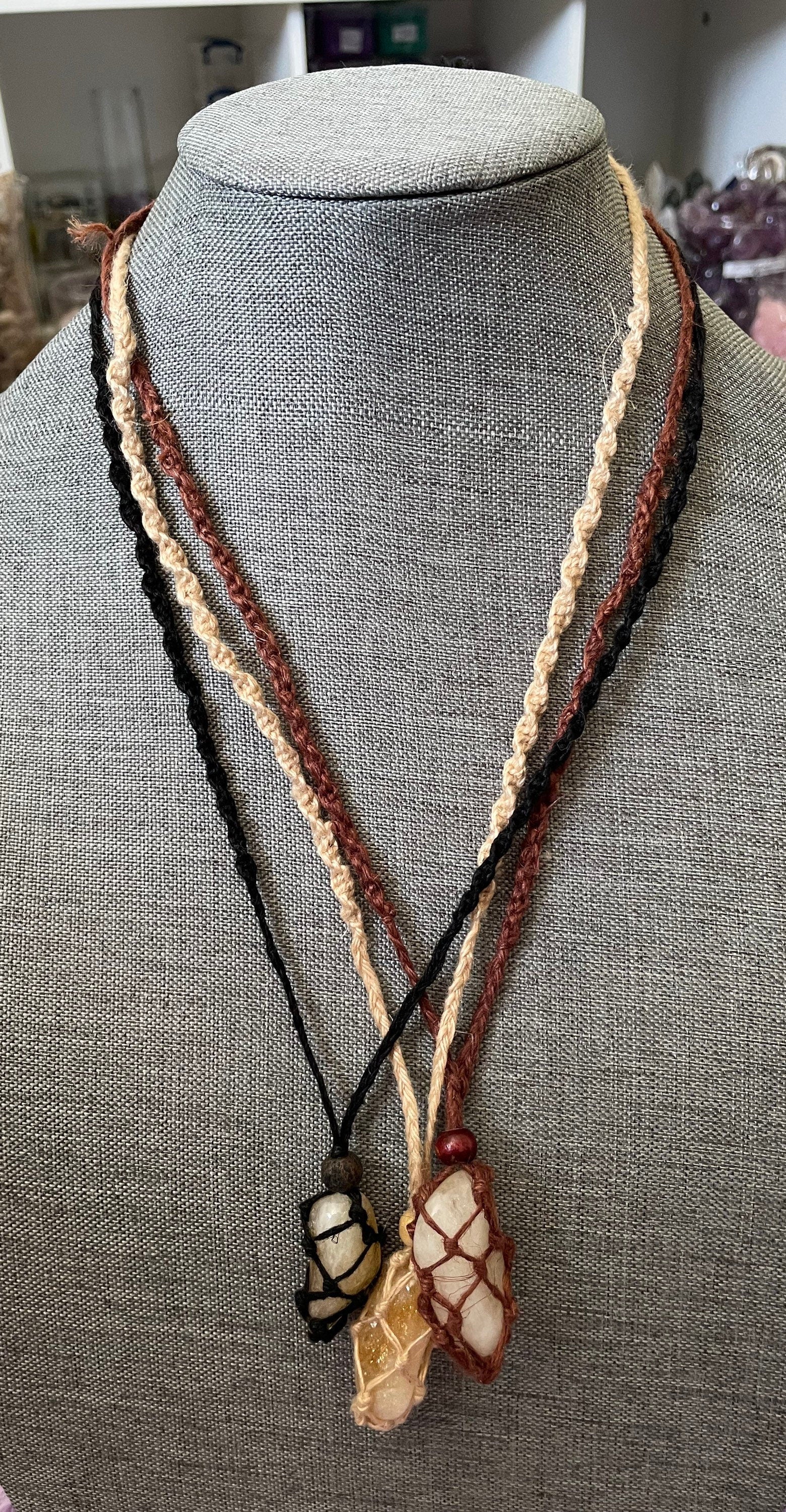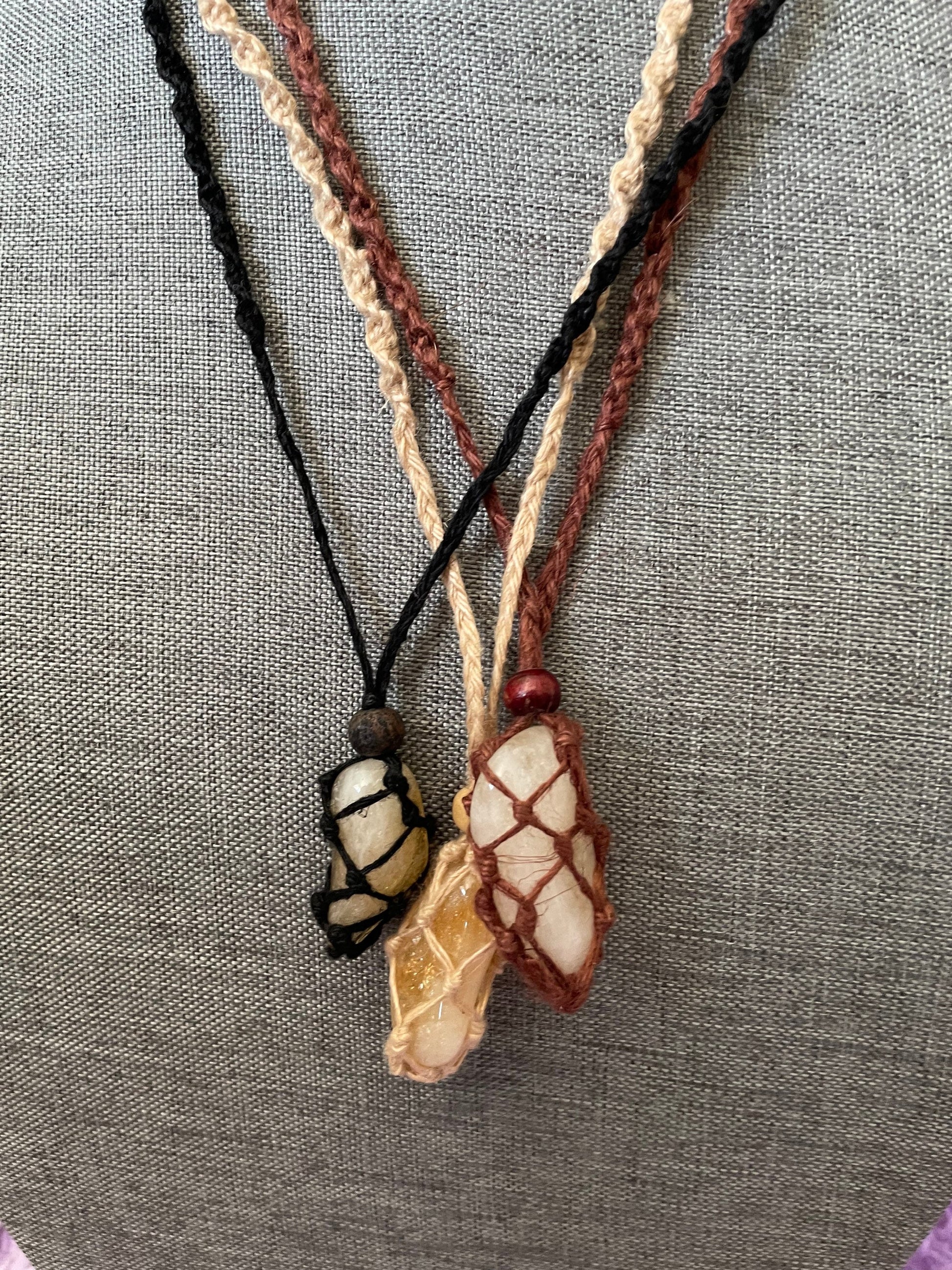 These one of a kind Hemp macramé necklaces come in three colors: black, brown and tan, with one Citrine stone. The necklace is 12-13 inches in length. None are exactly the same!! When you receive your necklace, it will be prefilled with one Citrine crystal and will arrive safely in a pretty mesh pouch. Also included are crystal care and cleansing instructions along with a crystal properties card.