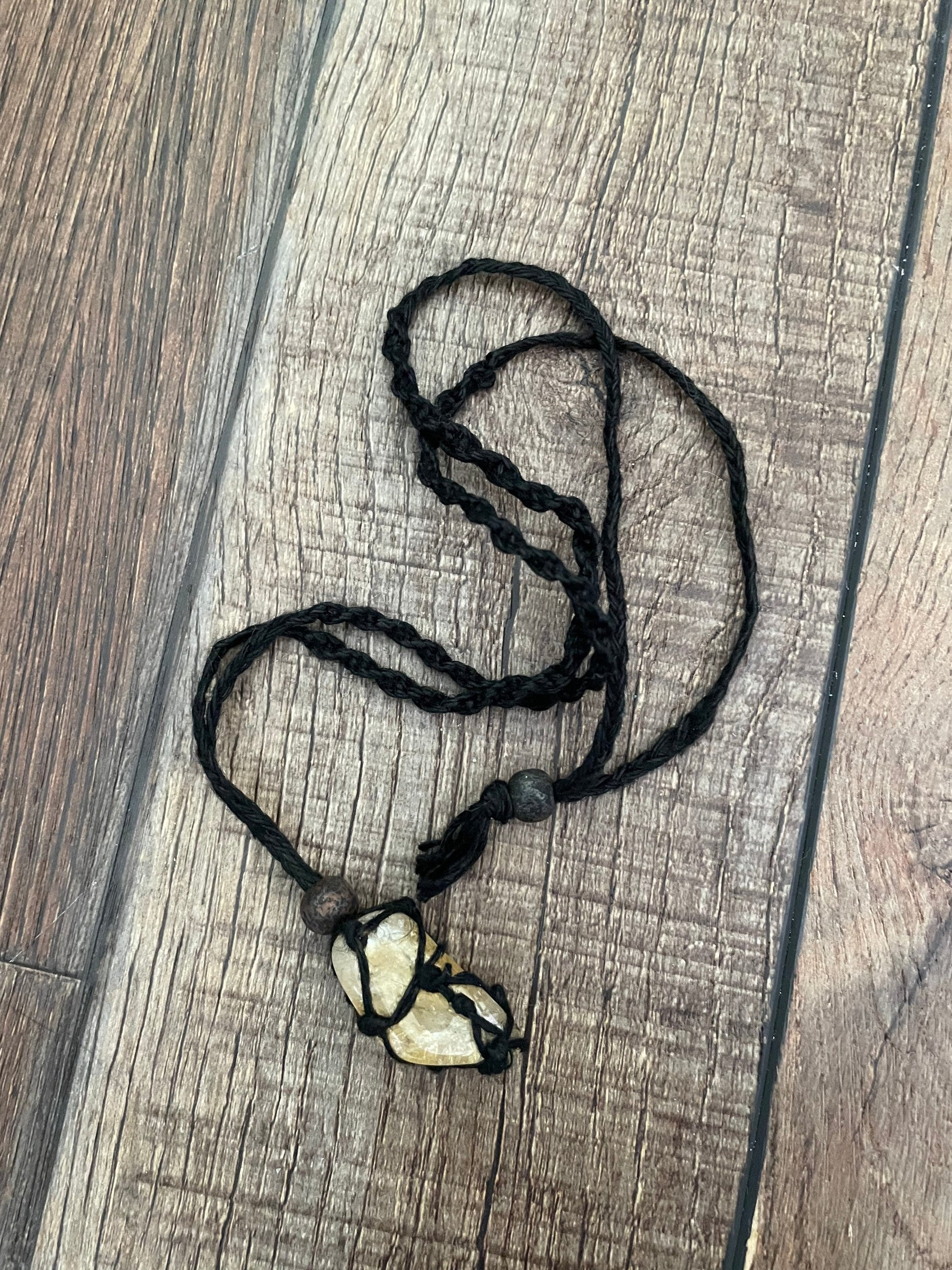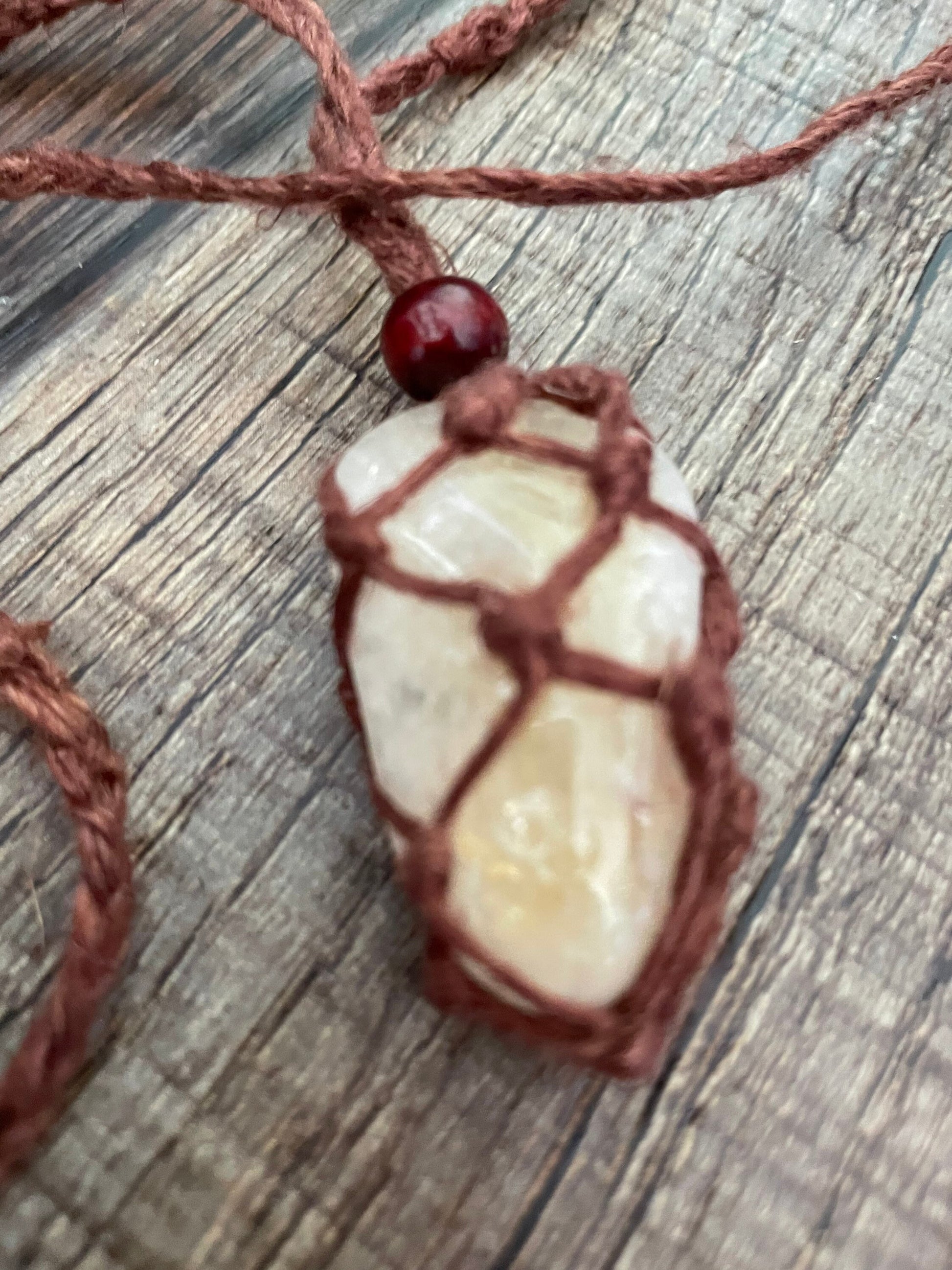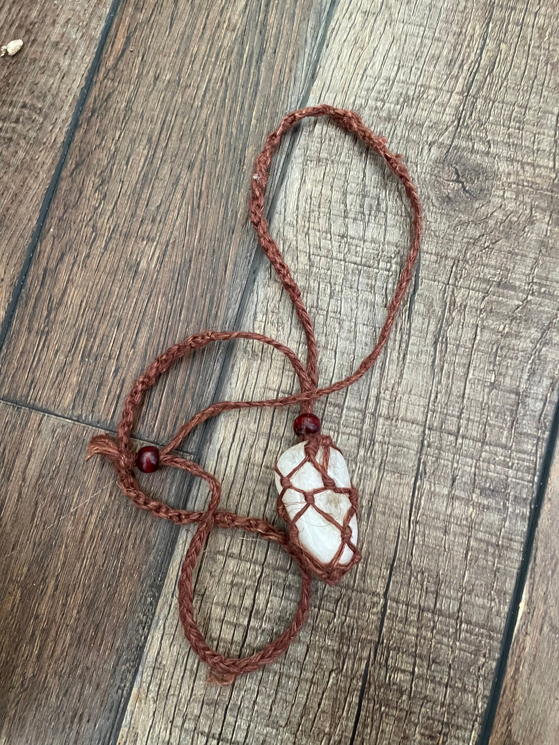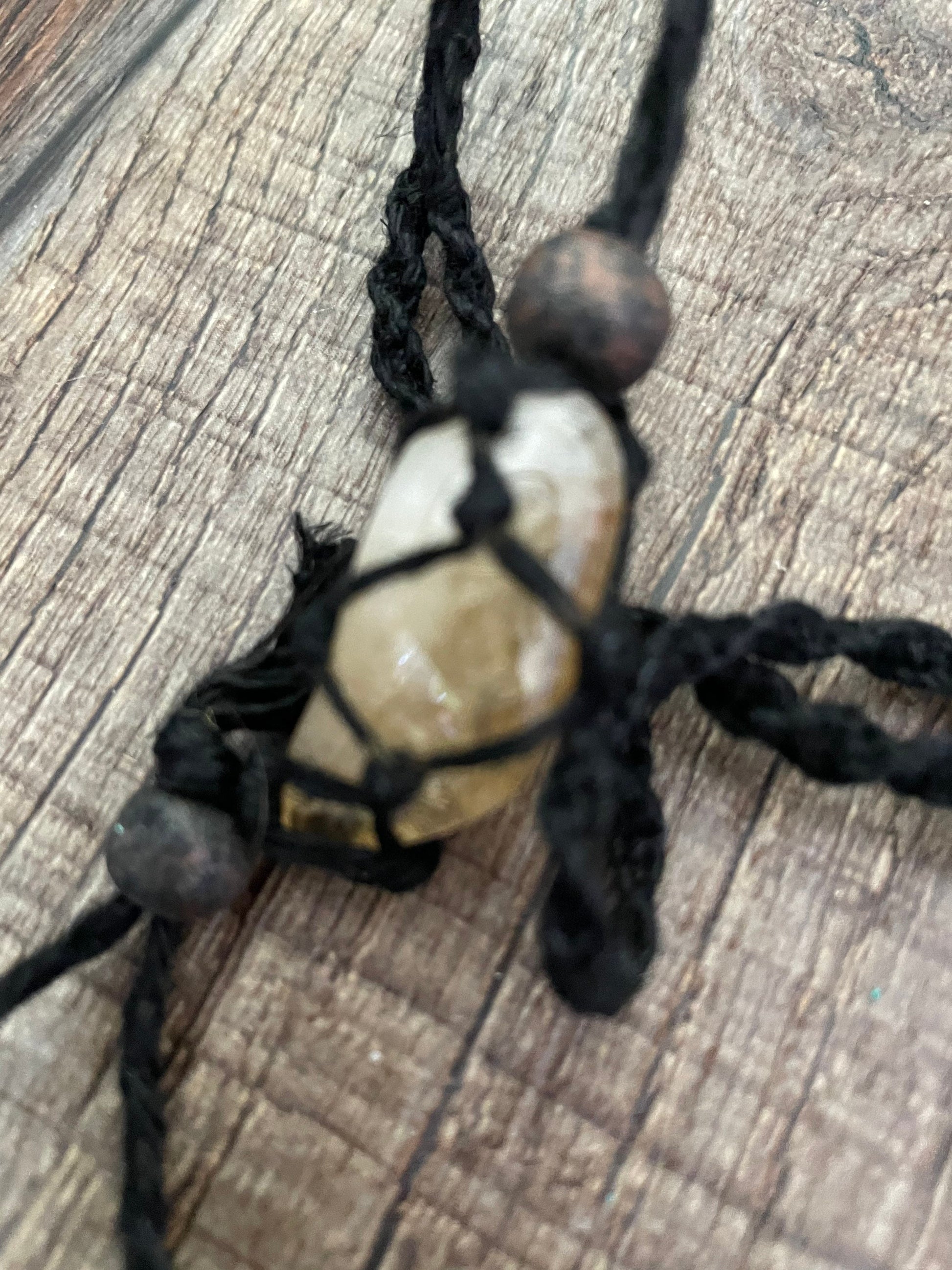 These one of a kind Hemp macramé necklaces come in three colors: black, brown and tan, with one Citrine stone. The necklace is 12-13 inches in length. None are exactly the same!! When you receive your necklace, it will be prefilled with one Citrine crystal and will arrive safely in a pretty mesh pouch. Also included are crystal care and cleansing instructions along with a crystal properties card.