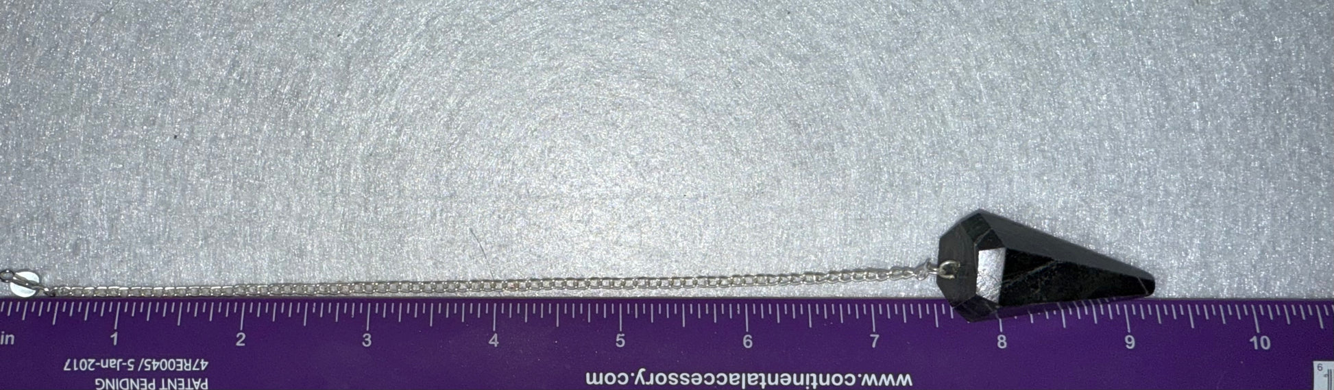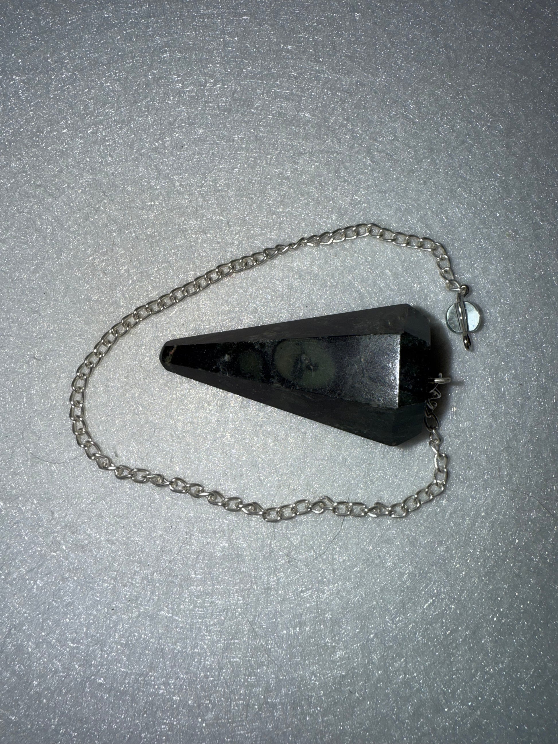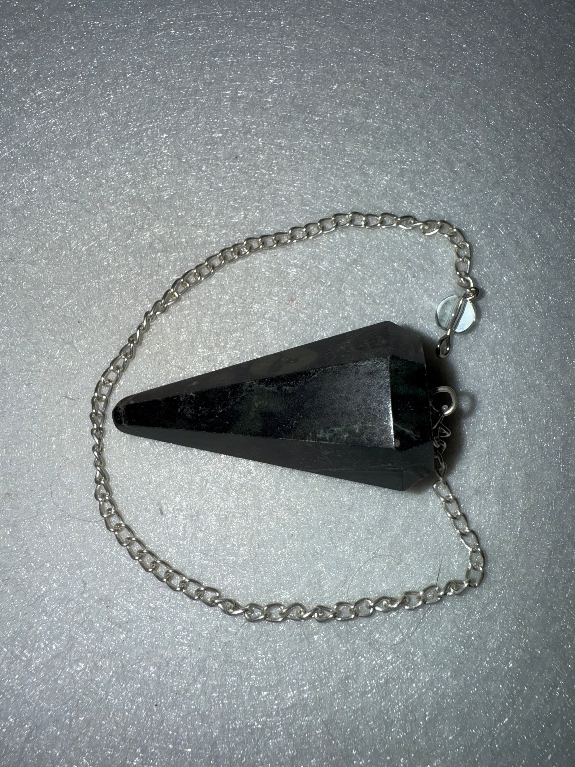 This beautiful Serpentine Pendulum is 1.75” and with chain is 9.25”.Please look at all pictures to see all sides of this pendulum.
