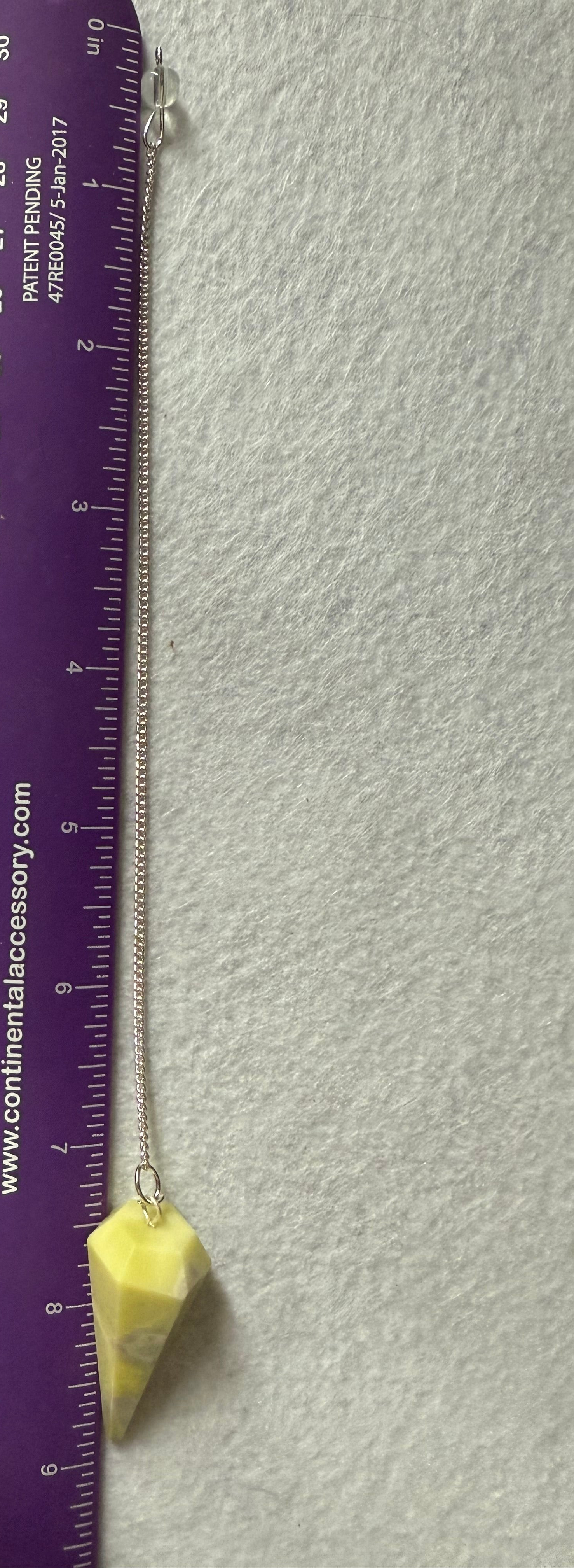 This beautiful Serpentine Pendulum is 1.65” and with chain is 9”. Please look at all pictures to see all sides of this pendulum.
